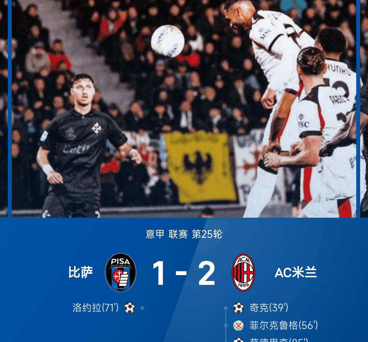 ทั้งสองฝ่ายแสดงให้เห็นถึงระเบียบการป้องกันที่แข็งแกร่งในครึ่งแรก โดยมีเพียงห้าครั้งที่ยิงประตูได้ พิซาสร้างโอกาสหนึ่งต่อหนึ่งในนาทีที่ 29 ผ่านการส่งบอลทะลุช่องอย่างรวดเร็ว แต่ผู้รักษาประตูของมิลานเซฟไว้ได้ เมื่อครึ่งแรกใกล้จะจบลง มิลานทำลายความเสมอด้วยลูกโหม่งของชิค ขึ้นนำ 1-0 ในช่วงพักครึ่ง หลังจากมีการเปลี่ยนตัว ราบีโยต์ยิงไกลให้มิลาน แต่ถูกตัดสินให้เป็นลูกล้ำหน้า จากนั้นพิซาได้จุดโทษเฟอร์ครูเกอร์พลาดจุดโทษไปอย่างน่าเสียดาย พิซาฉวยโอกาสจากลูกบอลยาวตีเสมอได้สำเร็จ ในช่วงวิกฤติ โมดริชของมิลานและริชชี่ประสานงานกันอย่างยอดเยี่ยมทะลุแนวรับ ก่อนที่ริชชี่จะจ่ายให้จอมทัพชาวโครเอเชียยิงประตูขึ้นนำอีกครั้ง ในช่วงทดเวลาบาดเจ็บ ราบีโอต์ได้รับใบเหลืองที่สองจากการประท้วง กลายเป็นใบแดงถูกไล่ออกจากสนาม สุดท้ายมิลานคว้าชัยชนะอย่างสุดมันส์ คว้าสามแต้มสำคัญเหนือทีมน้องใหม่ในฤดูกาลนี้ได้สำเร็จ