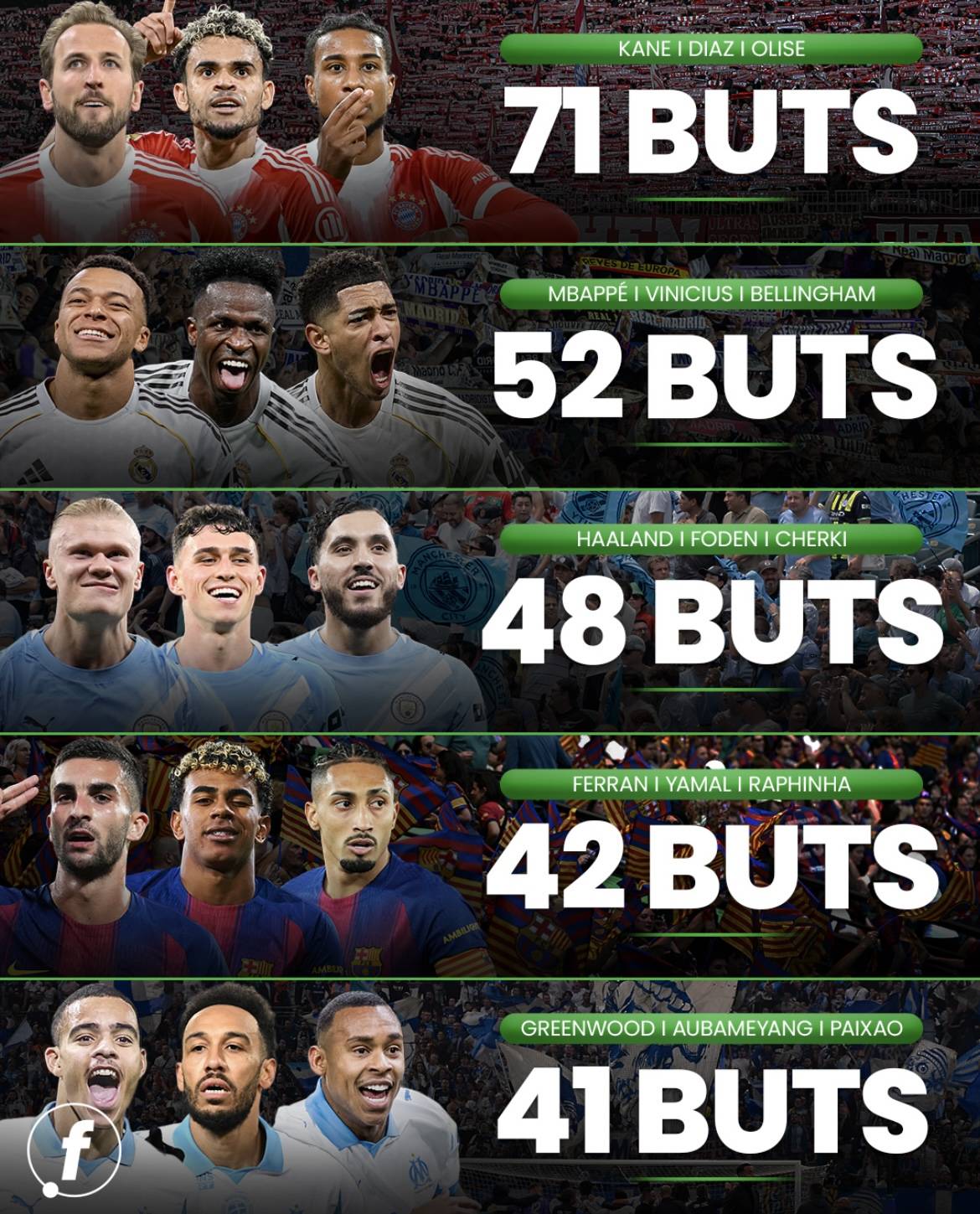 สื่อต่างประเทศได้รวบรวมรายชื่อสามประสานยอดเยี่ยมของสโมสรที่ทำประตูได้มากที่สุดในฤดูกาลนี้ โดยสามประสานของบาเยิร์น มิวนิค ทำประตูรวมได้ 71 ประตู, เรอัล มาดริด 52 ประตู, แมนเชสเตอร์ ซิตี้ 48 ประตู, บาร์เซโลนา 42 ประตู และมาร์กเซย 41 ประตู – ช่องว่างนั้นชัดเจนสำหรับทุกคนที่จะเห็นอย่างไรก็ตาม การจะตัดสินว่าใครคือ "ผู้ยิ่งใหญ่ที่สุด" อย่างแท้จริงนั้น การนับจำนวนประตูรวมเพียงอย่างเดียวอาจยังไม่เพียงพอ คุณภาพของเกียรติยศที่ได้รับ ผลกระทบในแมตช์สำคัญ ความแข็งแกร่งที่เสริมกันของทั้งสามคน ความสม่ำเสมอ รวมถึงศักยภาพในการเติบโตในอีกสองถึงสามปีข้างหน้า ล้วนเป็นปัจจัยที่เปลี่ยนแปลงมุมมอง – ในบรรดาห้าคู่หูนี้ ใครคือสามคนที่แข็งแกร่งที่สุดอย่างแท้จริง?