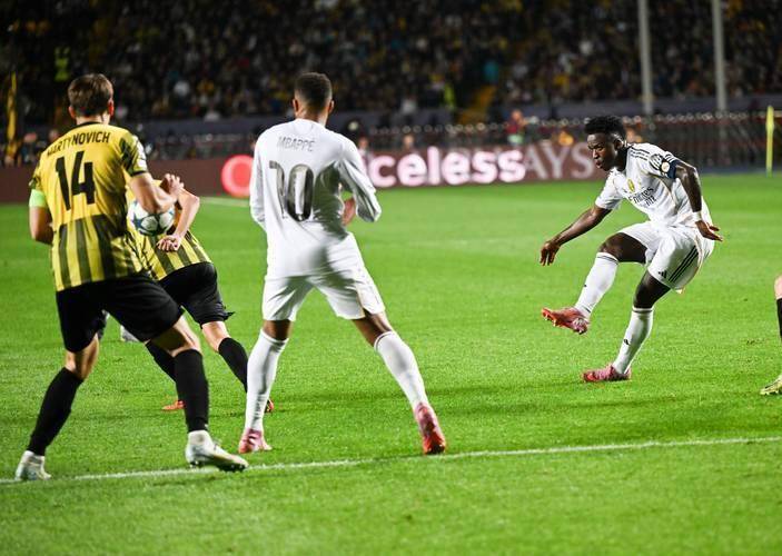 หลังจากควบคุมบอลได้ วินิซิอุสพบว่าตัวเองไม่ได้เผชิญหน้ากับพื้นที่ว่าง แต่กลับถูกกองหลังตัวกลางของฝ่ายตรงข้ามขยับเข้ามาเล็กน้อย เขาไม่ลังเลเลยแม้แต่น้อย ก่อนจะปั่นบอลด้วยเท้าขวา ส่งบอลพุ่งเสียบมุมไกลอย่างแม่นยำ