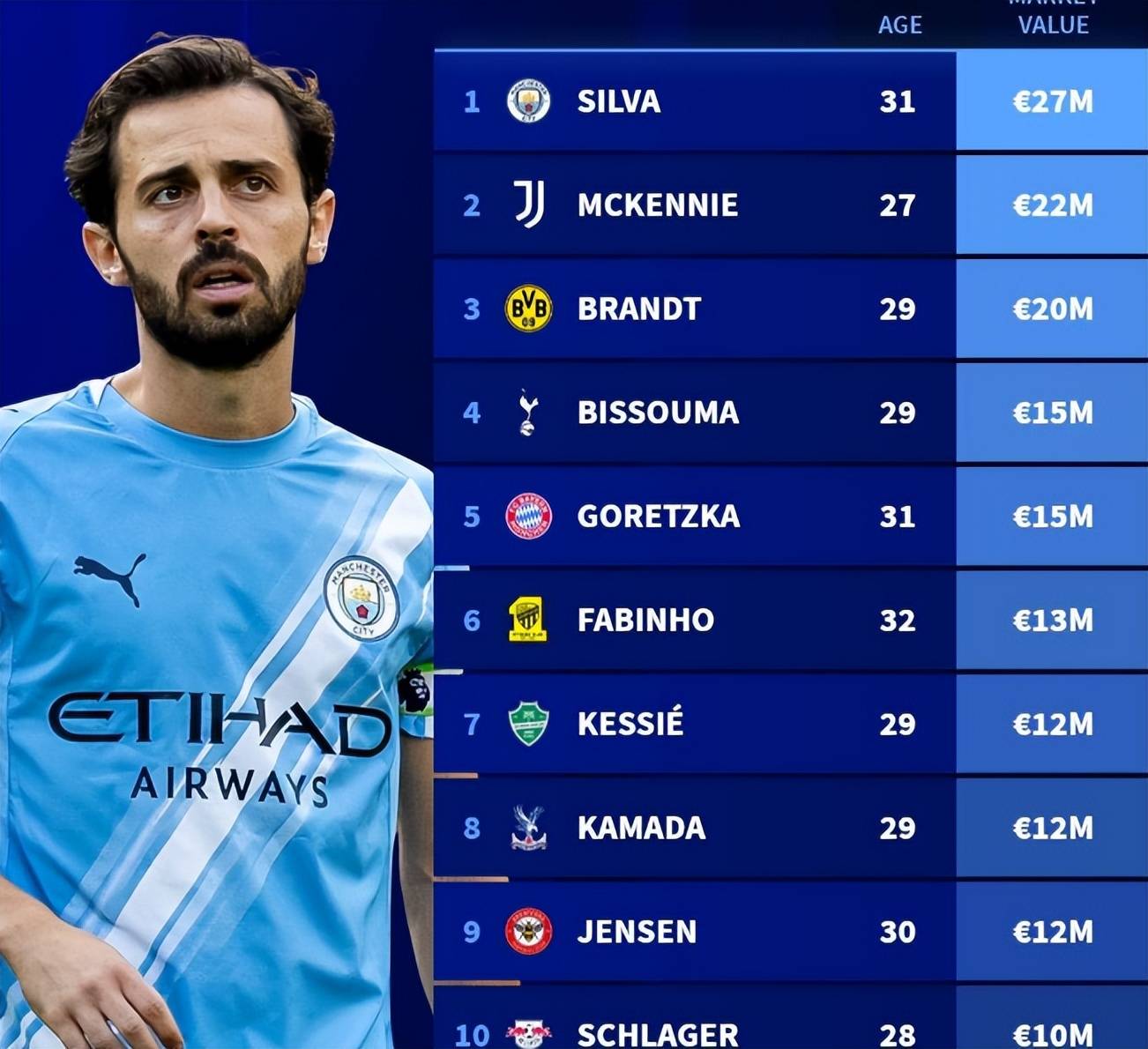 แบร์นาร์โด ซิลวา (แมนเชสเตอร์ ซิตี้, มูลค่า 27 ล้านยูโร): ด้วยทักษะทางเทคนิคที่ประณีตและไหวพริบในเกมฟุตบอลที่ยอดเยี่ยม เขาโดดเด่นในพื้นที่แคบและมีความสามารถทั้งในเกมรุกและเกมรับ สามารถเล่นได้หลากหลายตำแหน่งในแดนกลาง เขาเป็นองค์ประกอบสำคัญในระบบที่เน้นการครองบอล ช่วยเพิ่มความยืดหยุ่นทางแท็คติกให้กับทีมอย่างมีนัยสำคัญ