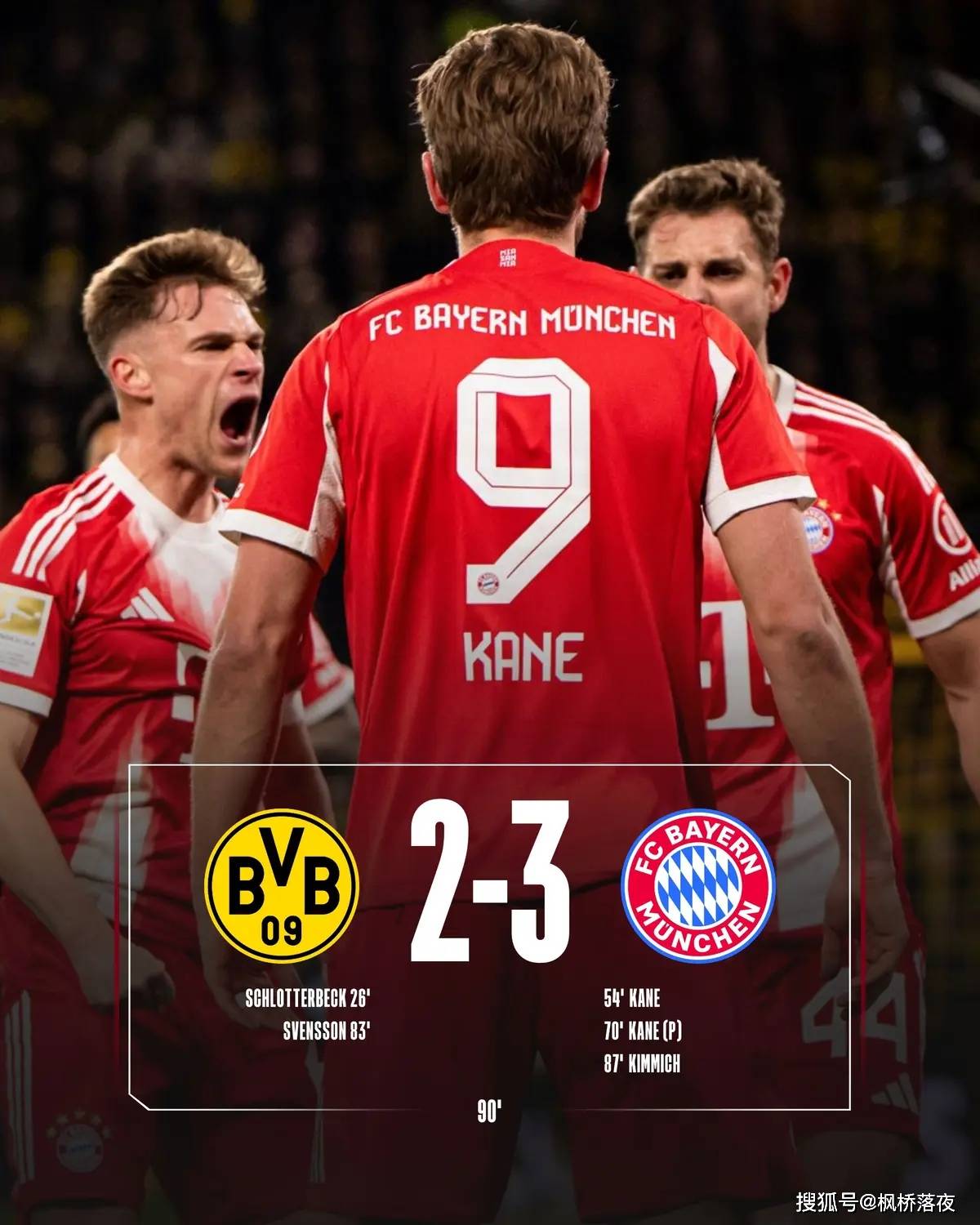 เมื่อเสียงนกหวีดสุดท้ายดังขึ้น คิมมิชถูกเพื่อนร่วมทีมยกขึ้นสูง ขณะที่เคนยิ้มและกอดมูเซียลา ส่วนอีกฝั่งหนึ่ง กัปตันดอร์ทมุนด์ เอ็มเร่ ชาน ถูกเปลี่ยนตัวออกเนื่องจากบาดเจ็บ ดวงตาของเขาเต็มไปด้วยความผิดหวัง
