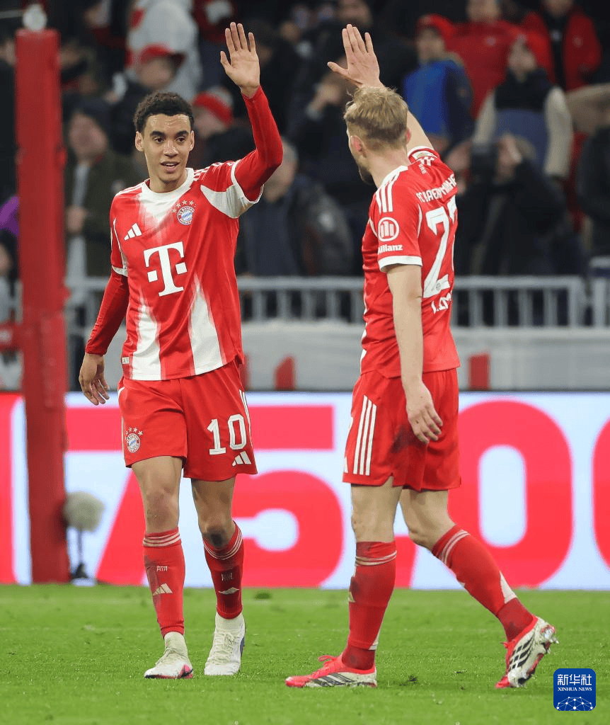 ในวันที่ 6 มีนาคม ผู้เล่นของบาเยิร์น มิวนิค มูเซียลา (กลาง) และเพื่อนร่วมทีม บิสซูโก (ขวา) ฉลองประตูในเกม