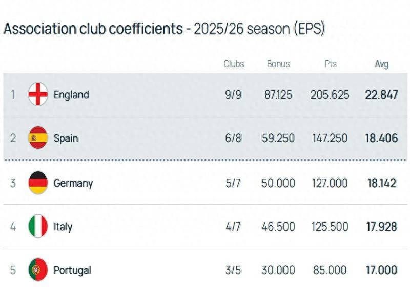 ตามอันดับล่าสุดที่ยูฟ่าออกแม้ว่าพรีเมียร์ลีกจะประสบภาวะตกต่ำรวมก็ยังเป็นลีกแรกในฤดูกาลเดียว แต่การขึ้นนำลดลงจาก 5 แต้มหลังจากจบลีกเป็น 4.4 แต้มในตอนนี้ แม้ทีมทั้งหมด 9 ทีมจะออก พรีเมียร์ลีก อาจจะไม่แพ้ที่หนึ่ง แม้ว่าในที่สุดมันจะแซงหน้าลีก แต่ก็แทบจะเป็นไปไม่ได้เลยที่จะแซงหน้าสองลีกในเวลาเดียวกัน พรีเมียร์ลีกโดยทั่วไปล็อคสองอันดับแรก