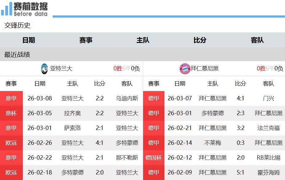 ก่อนสถานการณ์ของทั้งสองทีม! แอตแลนต้าอยู่ในอันดับที่ 15 ในแชมเปี้ยนส์ลีก และโบรุสเซีย ดอร์ทมุนด์ ถูกตกรอบในรอบเพลย์ออฟเพื่อผ่านเข้าสู่รอบน็อคเอาท์ บาเยิร์น ยูฟ่า แชมเปี้ยนส์ลีก อยู่ในอันดับที่สองในรอบน็อคเอาท์ ปัจจุบันแอตแลนต้าอยู่ในอันดับที่เจ็ดในเซเรียอา และบาเยิร์นเป็นผู้นำในบุนเดสลีกา แอตแลนต้ามีมูลค่า 3. 8.6 พันล้านยูโร บาเยิร์นมีมูลค่า 9. 600 ล้านยูโร ในเกมสุดท้าย แอตแลนต้าเสมอ 2-2 ในบ้านกับอูดิเนเซ่ บาเยิร์นเอาชนะโบรุสเซีย 4-1 ในบ้าน