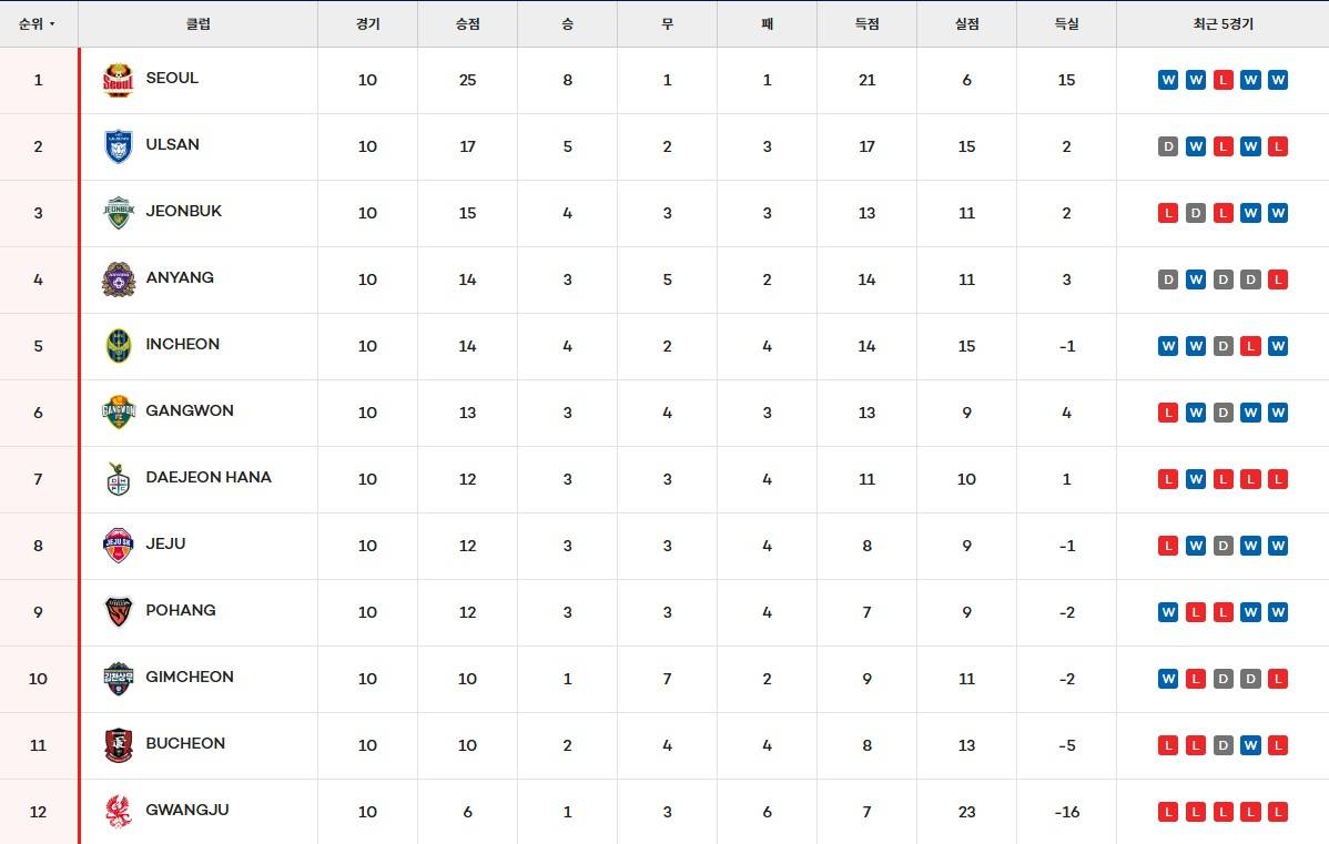 ในอันดับ ปูซาน ไอพาร์ค และซูวอน ซัมซุง เสมอกันด้วยคะแนนสูงสุด 22 แต้ม และปูซานก็ครองอันดับหนึ่งด้วยจำนวนประตูชั่วคราว โซล อีเลียน และ "พลาด" ของซูวอน เอฟซี ทำให้ทั้งสองทีมอยู่ในอันดับสาม (16 แต้ม) และอันดับที่สี่ (14 แต้ม) ชัยชนะครั้งแรกของ Longren FC ยังทำให้พวกเขาแซง Quannan Tianlong ได้สำเร็จและส่งคู่ต่อสู้ไปยังตำแหน่งที่สองต่อสุดท้าย สำหรับ Quannan Tianlong โค้ช Park Donghe บางทีการตัดสินตำแหน่งโค้ชของเขาอาจอยู่ไม่ไกล