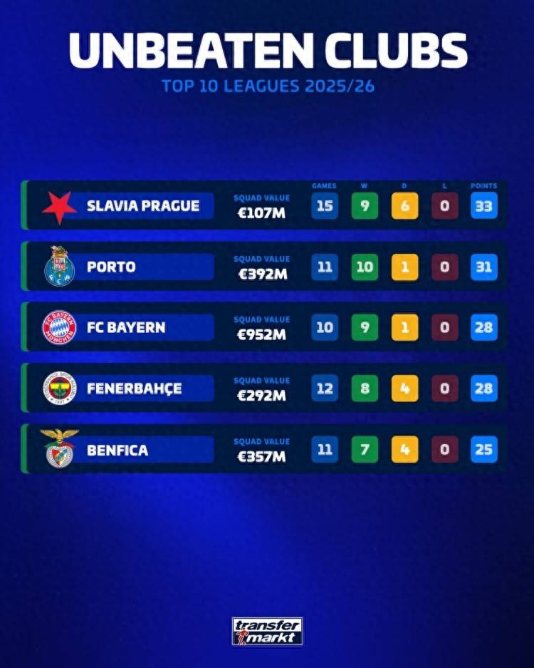 ตามสถิติจาก Transfermarkt มีเพียงห้าทีมจากสิบลีกชั้นนำของยุโรปเท่านั้นที่ยังไม่แพ้ใครในการแข่งขันลีกฤดูกาลนี้ ทีมเหล่านี้ประกอบด้วยสองทีมจาก Primeira Liga ของโปรตุเกส หนึ่งทีมจาก Bundesliga หนึ่งทีมจาก Süper Lig ของตุรกี และอีกหนึ่งทีมจาก First League ของสาธารณรัฐเช็ก
