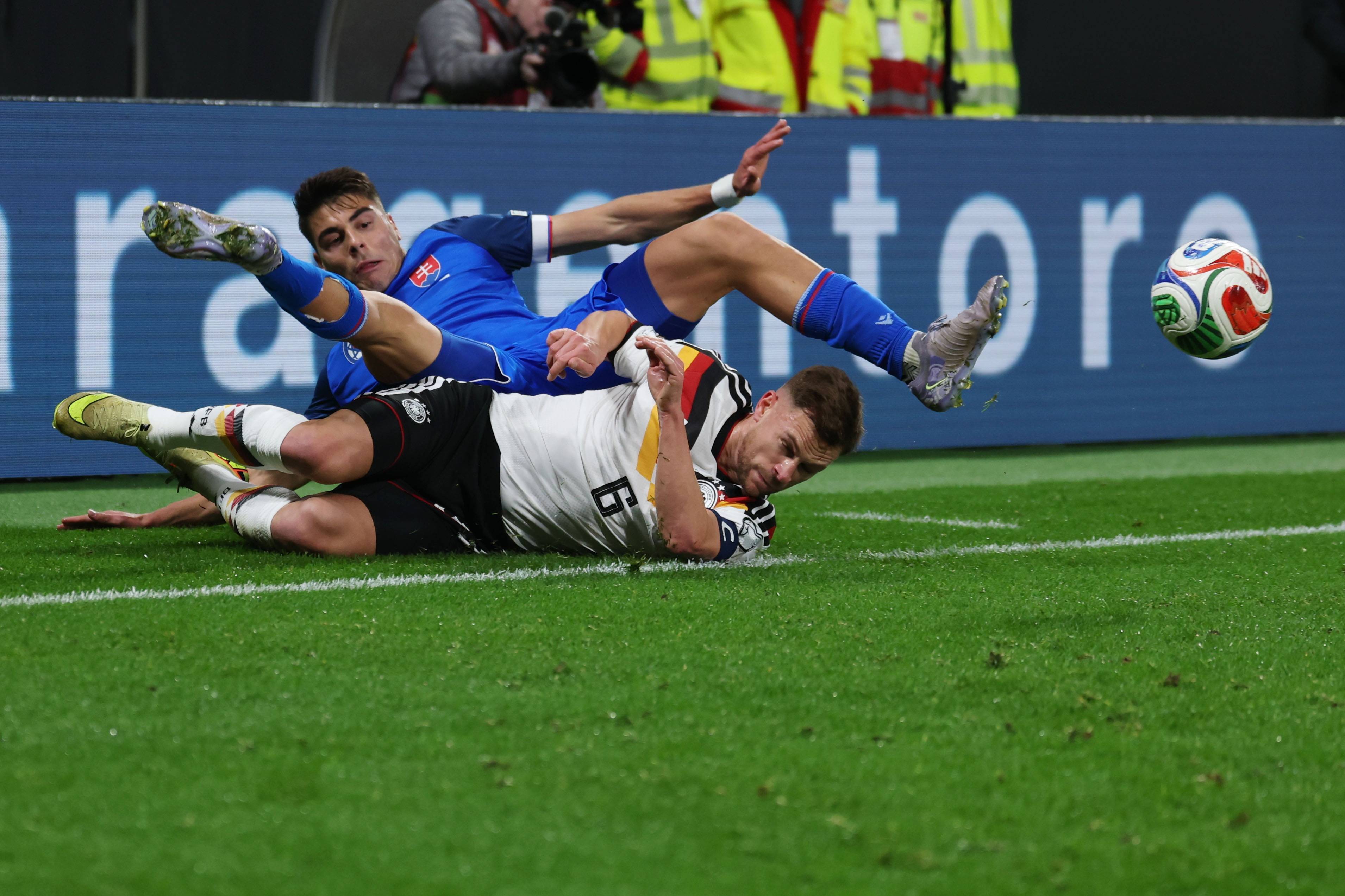 เมื่อวันที่ 17 พฤศจิกายน ลีออน โกเร็ตซ์ก้า ของเยอรมนี (ซ้าย) เข้าปะทะกับมาร์ติน ไซเบิลเลอร์ ของสโลวาเกียเพื่อแย่งบอล ซีเอ็นเอ/อีพีเอ