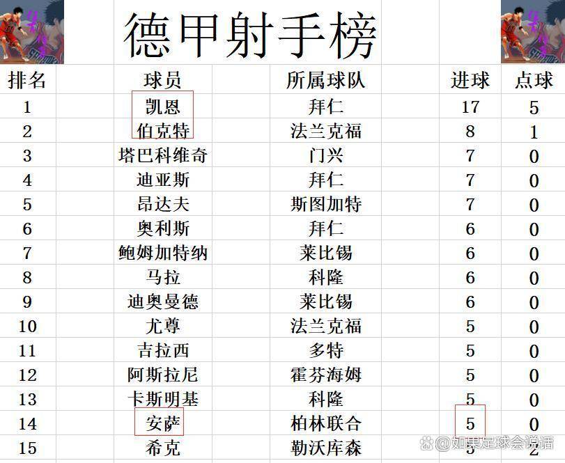 เมื่อมองไปที่ตารางคะแนนการทำประตู แฮร์รี่ เคน ของบาเยิร์นนำเป็นจ่าฝูงด้วย 17 ประตู มากกว่าอันดับสองถึงสองเท่า ดูเหมือนว่ารางวัลดาวซัลโวสูงสุดของบุนเดสลีกาในฤดูกาลนี้จะเป็นการแข่งขันที่ไม่มีคู่แข่ง อย่างไรก็ตาม การแข่งขันระหว่างผู้เล่นคนอื่นๆ ยังคงดุเดือด; อันซา ที่ทำประตูได้ในวันนี้ ได้ไต่อันดับขึ้นมาอยู่ในสิบอันดับแรกของตารางคะแนนการทำประตูแล้ว