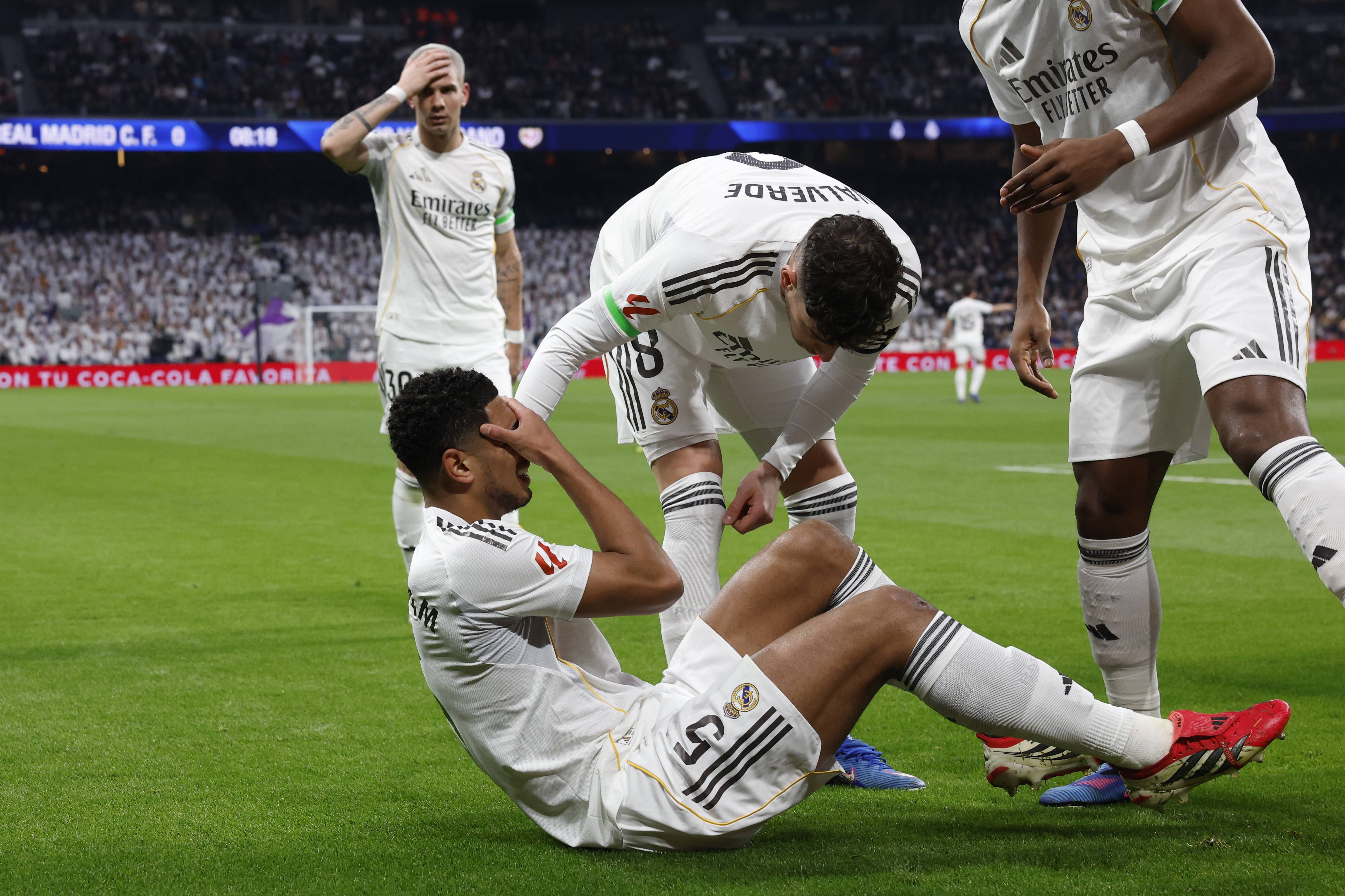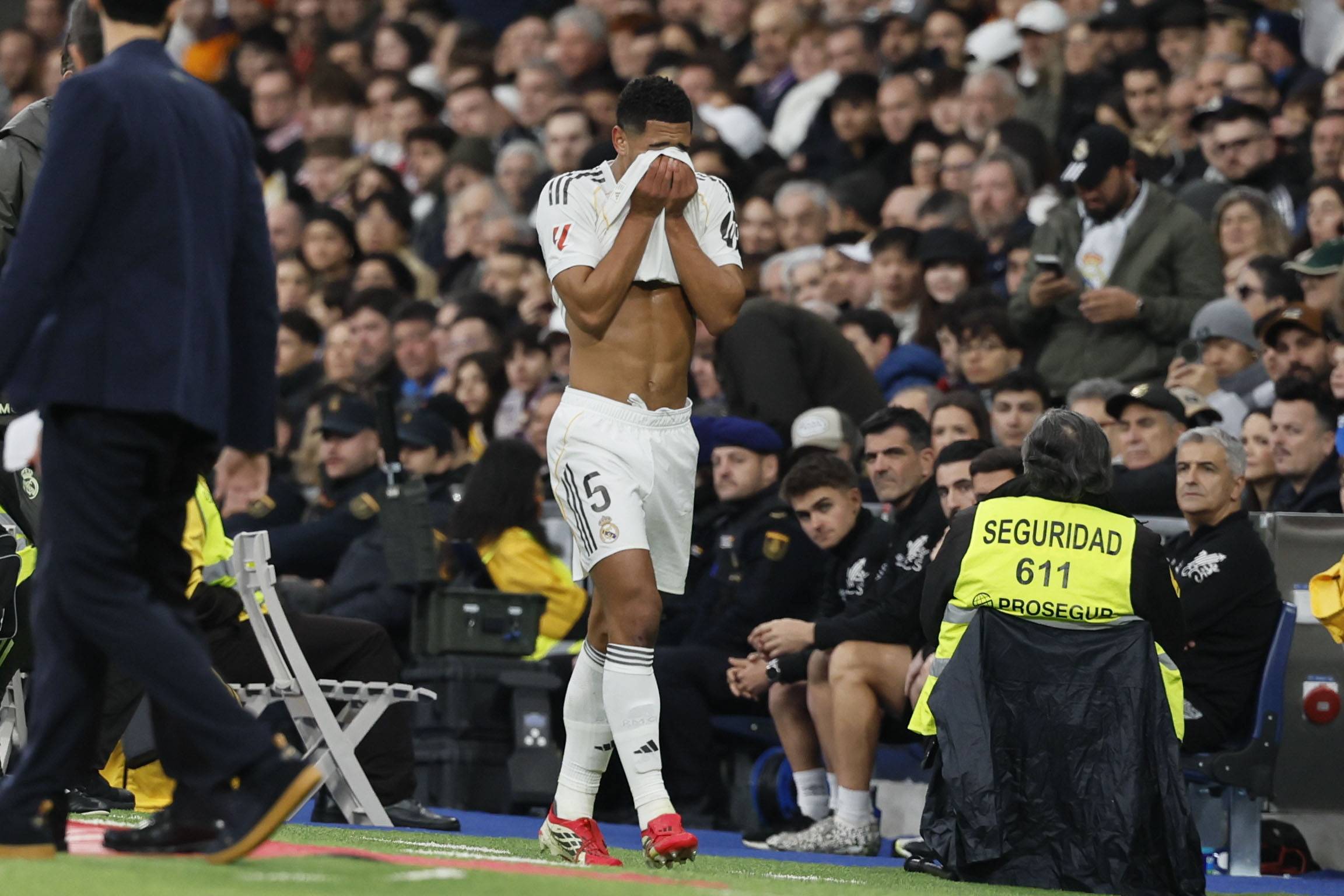 เมื่อวันที่ 1 กุมภาพันธ์ นักเตะเรอัล มาดริด จู๊ด เบลลิงแฮม (กลาง) ถูกเปลี่ยนตัวออกเนื่องจากอาการบาดเจ็บ. ชินหัว/อีพีเอ
