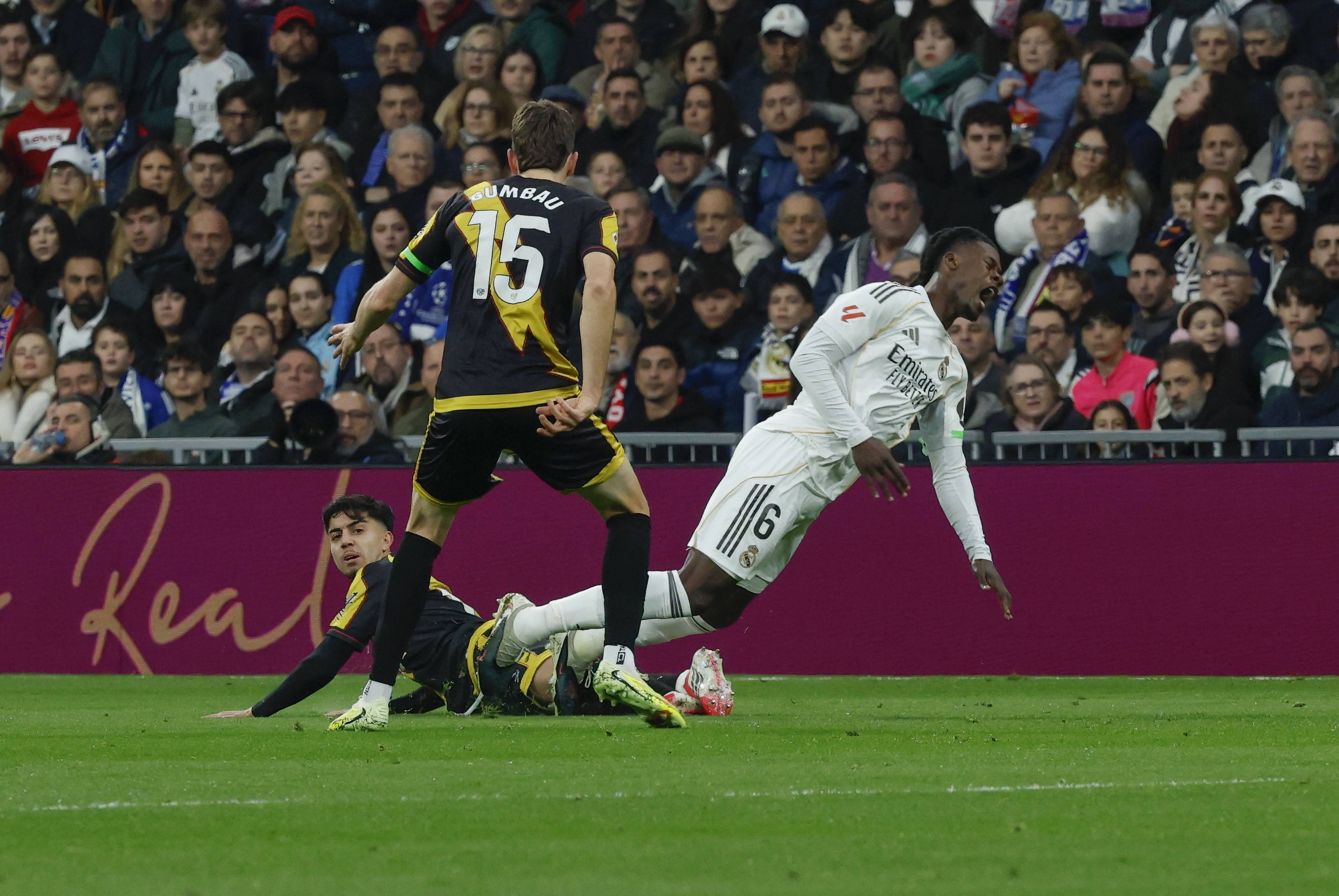 เมื่อวันที่ 1 กุมภาพันธ์ นักฟุตบอลของเรอัล มาดริด เอดูอาร์โด้ กามาวินก้า (ขวา) ล้มลงกับพื้นระหว่างการแข่งขัน ซินหัว/EPA