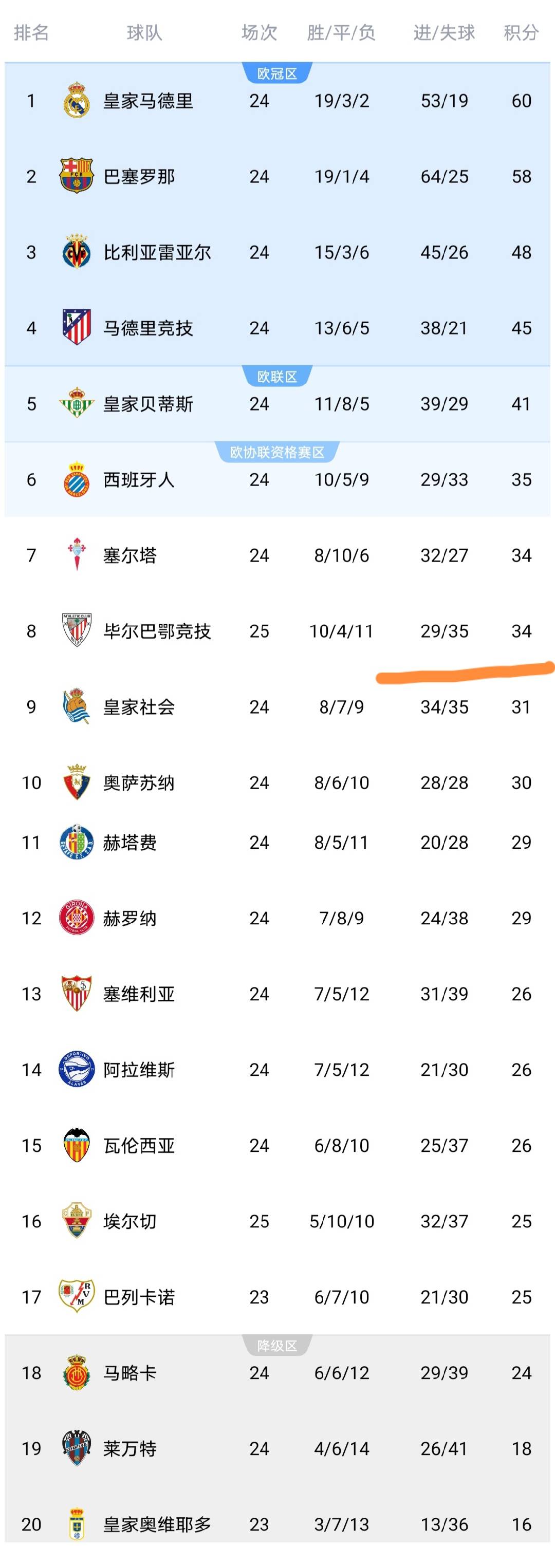 ในช่วงเช้าตรู่ของวันนี้ การแข่งขันลาลีกา รอบที่ 25 ได้สิ้นสุดลงด้วยการพบกันระหว่างแอธเลติก บิลเบา และเอลเช่ หลังจบการแข่งขันนี้ อันดับในตารางลีกได้เปลี่ยนแปลงไป ขอให้เราพิจารณาการเปลี่ยนแปลงที่เกิดขึ้น
