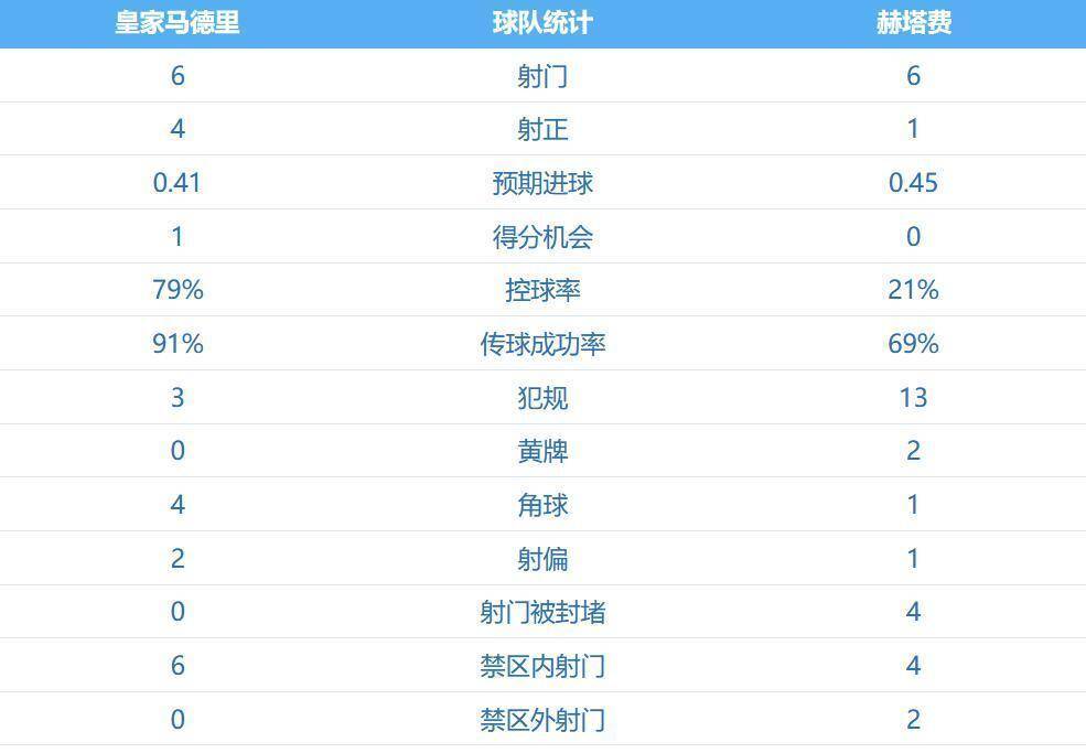 สถิติทางเทคนิคแสดงเกม "ไม่มีพลัง" ทั่วไป เรอัล มาดริด มีอัตราการครองบอล 77% ยิง 18 ถึง 7 ครั้ง เตะมุม 11 ต่อ 1 และจำนวนการจ่ายบอลมากกว่าคู่ต่อสู้สามเท่า แต่จำนวนลูกยิงในการบวชคือ 7 ต่อ 1 และจำนวนประตูคือ 0 ต่อ 1 Getafe ใช้สามตัวชี้ด้วยคลื่นโลกและการป้องกันเหล็ก