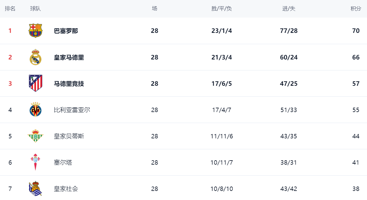 ในอันดับ บาร์เซโลน่ายังคงเป็นผู้นำ โดยทำคะแนนได้ 70 แต้ม โดยมีสถิติชนะ 23 เสมอ 1 และแพ้ 4 บาร์เซโลน่า ยังคง ปราบ เรอัล มาดริด นำ 4 แต้ม เรอัล มาดริด จบอันดับสองด้วยคะแนน 66 แต้ม แอตเลติโก มาดริด ทำได้เพียง 57 แต้ม อันดับสาม ที่สี่คือบียาร์เรอัลซึ่งทำคะแนนได้ 55 คะแนน รอยัล เบติส ทำได้เพียงเสมอ เสมอ ด้วยคะแนนรวม 44 คะแนน อันดับที่ 5 ซึ่งเป็นช่องว่างขนาดใหญ่ที่มีทีมอยู่ข้างหน้าเขา เซลต้ามีทั้งหมด 41 คะแนน อันดับที่หก