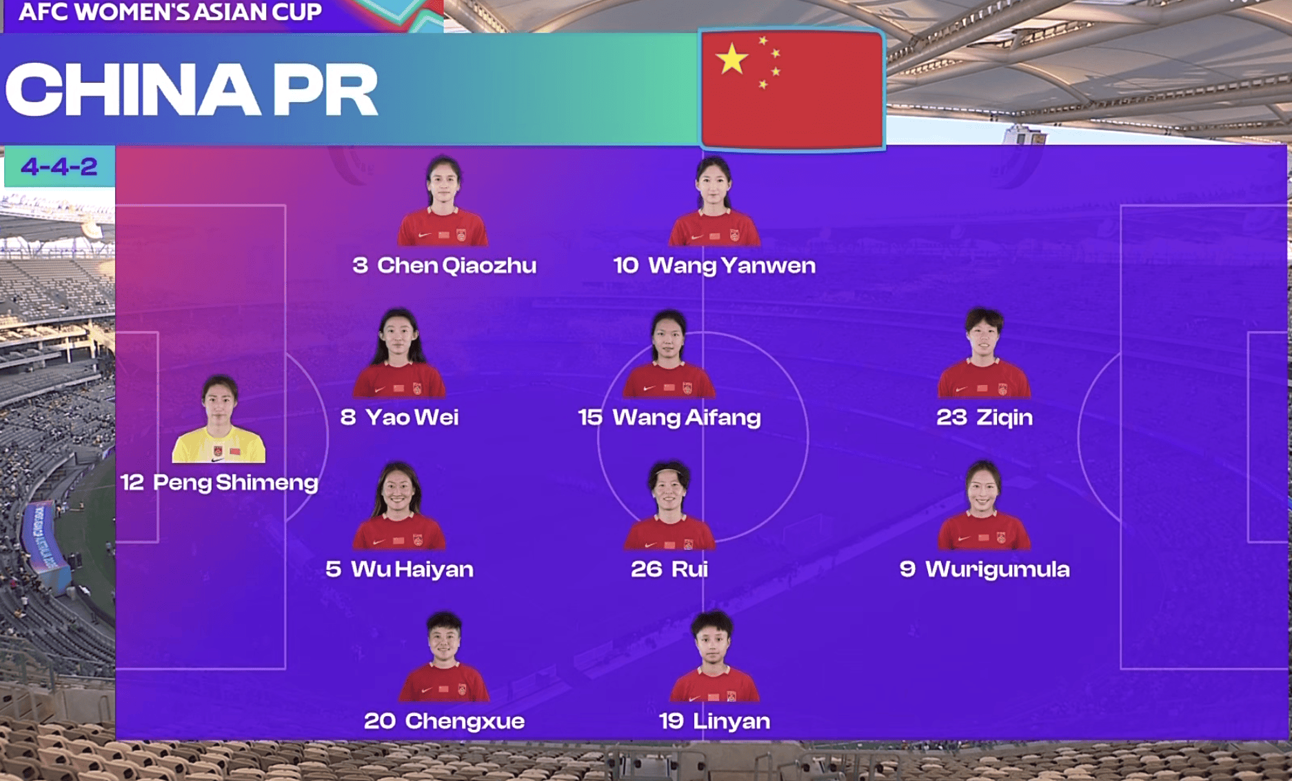 ในแง่ของการเริ่มต้นผู้เล่นทีมฟุตบอลหญิงของจีนกำลังเผชิญหน้ากับคู่ต่อสู้ในรูปแบบ 442 Shao Ziqin และ Wuri Gumu ดึงกองหน้าทั้งสองคือ Wang Yanwen, Wang Aifang, Zhang Rui และ Zhang Linyan กองกลางและ 4 กองหลัง Chen Qiaozhu, Yao Wei, Wu Haiyan และ Zhang Chengxue และ Peng Shimeng และ Peng Shimeng เป็นผู้รักษาประตูคนแรก รูปแบบ 433 ของทีมออสเตรเลีย Fude, Kerr และ Fowler ก่อตั้งตรีศูล Kross, Kennedy และ Gori อยู่ในตำแหน่งกองกลางและกองหลังรวมถึง Tope, Cartley, Hunter และ Carpenter และ Arnold ผู้รักษาประตู