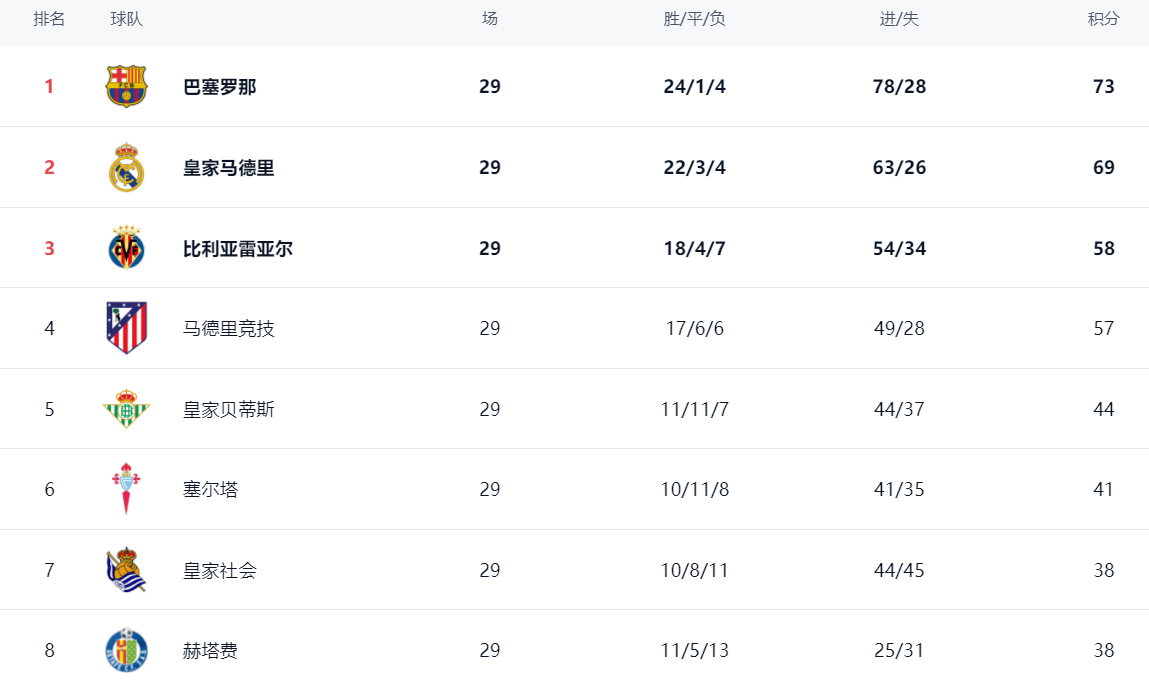 ในอันดับ บาร์เซโลน่ายังคงครองตำแหน่งสูงสุด โดยทำคะแนนได้ 73 แต้ม เรอัล มาดริด ตามมาติดๆ หลังชนะ 69 แต้ม ยังคงตามหลัง 4 แต้ม การแข่งขันชิงแชมป์ที่ดุเดือดมาก บียาร์เรอัล รั้งอันดับ 3 ด้วยคะแนน 58 คะแนน แอตเลติโก มาดริด เสีย 57 แต้ม อันดับที่สี่ Royal Betis อยู่ในอันดับที่ 5 ด้วยคะแนน 44 คะแนน เซลต้าทำคะแนนได้ 41 คะแนน อันดับที่ 6