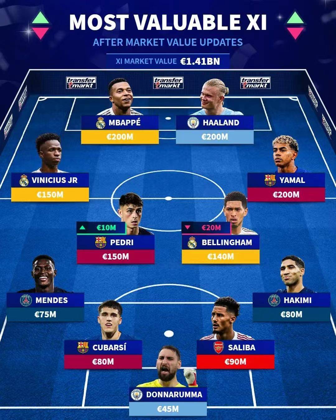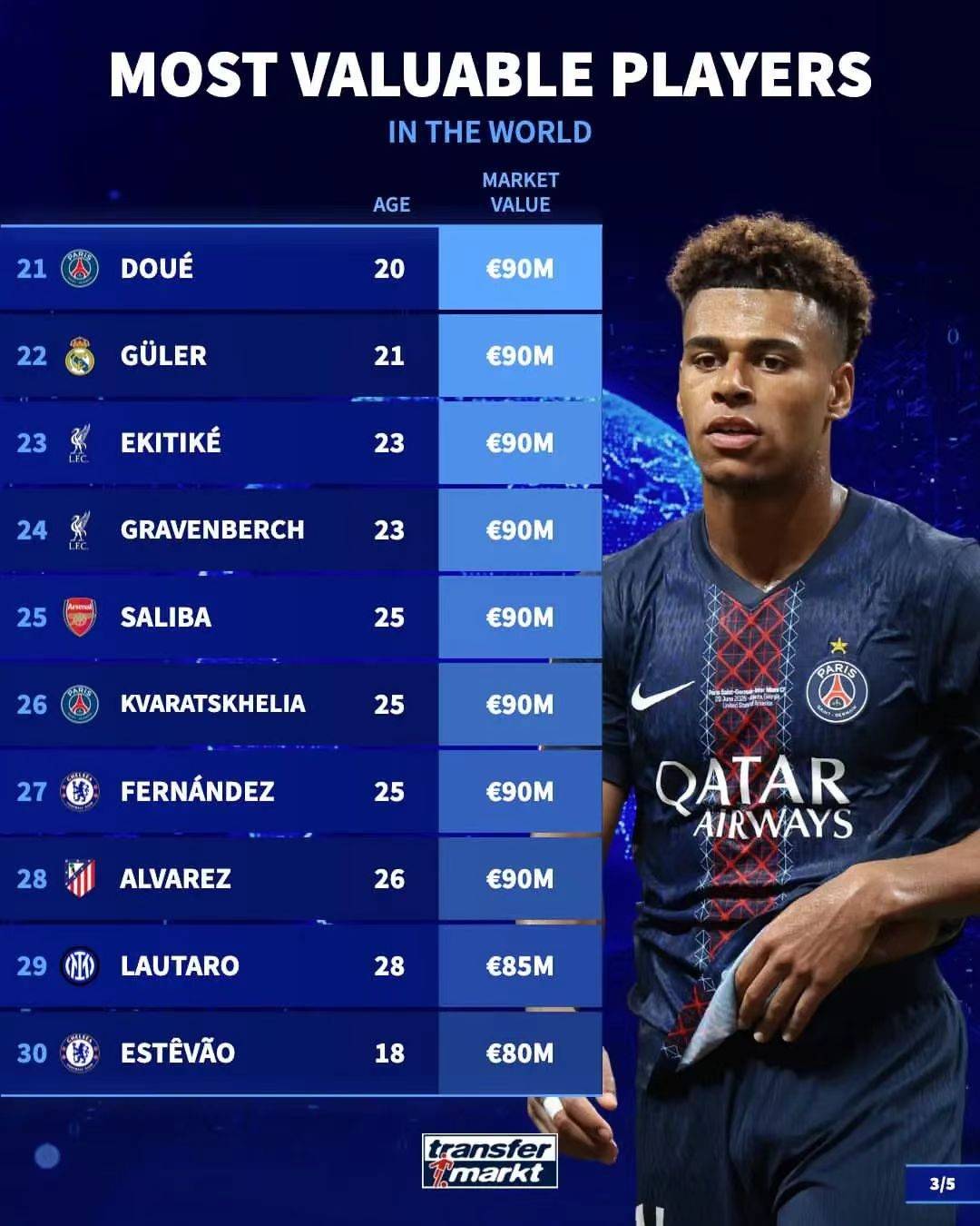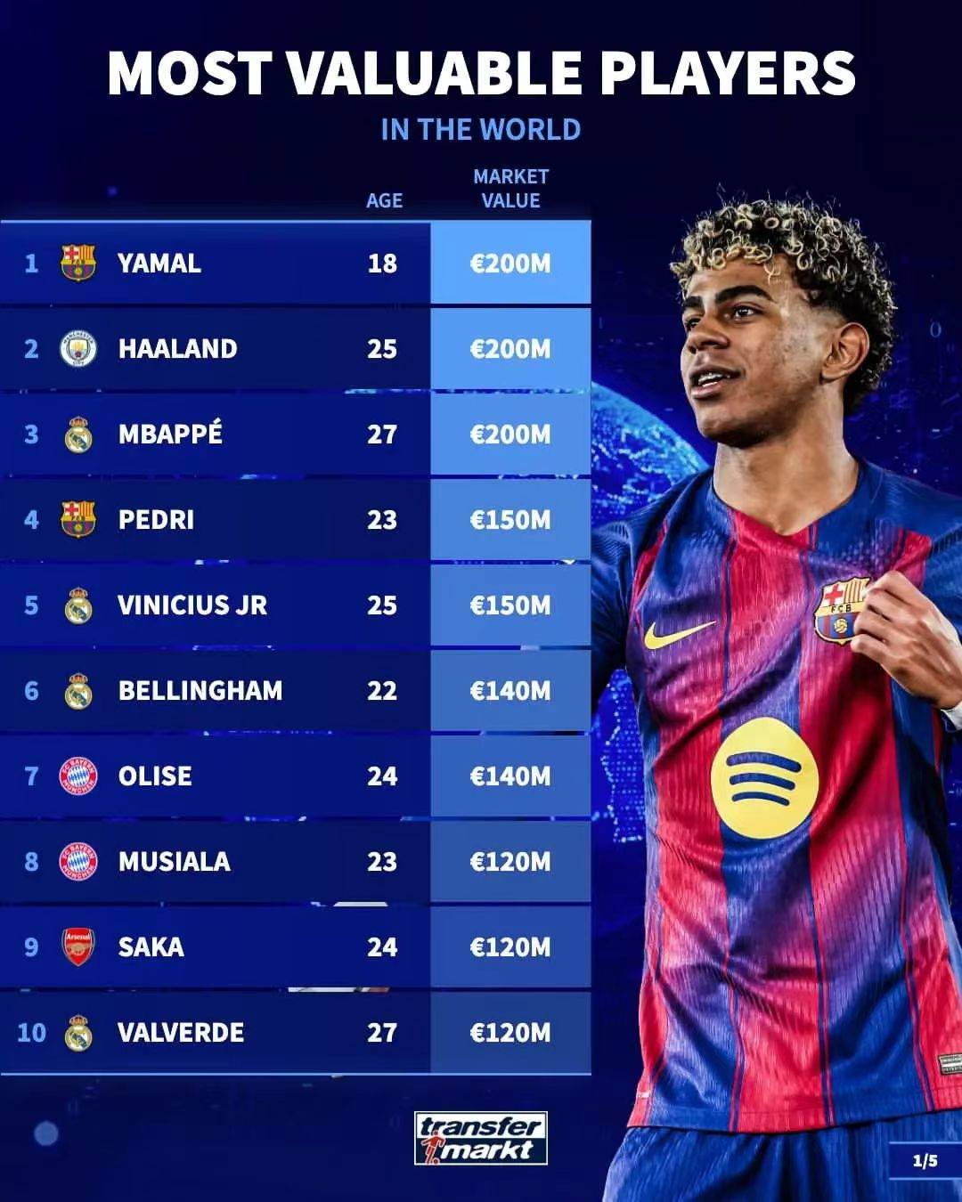 ในหมู่พวกเขา ผู้เล่นที่แพงที่สุดในลาลีกาคือ Yamal และ Mbappe มูลค่าของพวกเขาคือ 200 ล้านยูโร และผู้เล่นที่แพงที่สุดในพรีเมียร์ลีกคือฮาร์แลนด์ ปัจจุบันเขามีมูลค่า 200 ล้านยูโร ผู้เล่นที่มีค่าที่สุดในบุนเดสลีกาคือ Olisser ซึ่งกำลังเล่นอยู่ที่บาเยิร์น ในเซเรีย อา ที่มีค่าที่สุดคือ เลาตาโร่ จากอินเตอร์ มิลาน ซึ่งปัจจุบันมีมูลค่า 85 ล้านยูโร อยู่ในอันดับที่ 29 ในรายการ
