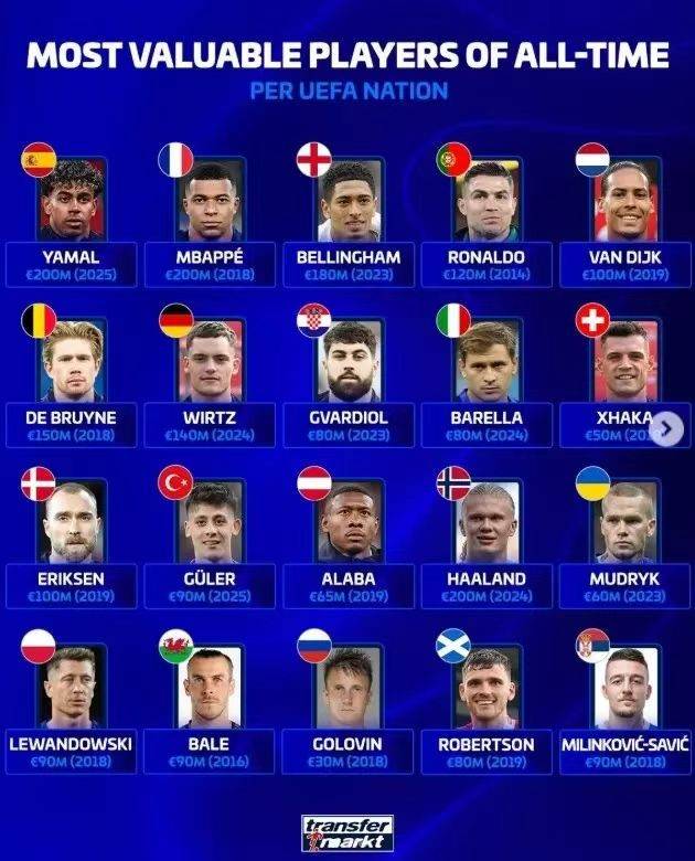 ในการจัดอันดับนักเตะทีมชาติยุโรปในประวัติศาสตร์ ทีมชาติสเปน ฝรั่งเศส และนอร์เวย์ ล้วนแล้วแต่เป็นนักเตะชั้นนำในปี 2026 และ เบลลิงแฮม ที่มีมูลค่าสูงสุดในอังกฤษ ปัจจุบันมีมูลค่า 180 ล้านยูโร โปรตุเกสคือโรนัลโด้ในปี 2014 เมื่อเขามีมูลค่า 120 ล้านยูโร นอกจากนี้ ฟาน ไดจ์ค ของเนเธอร์แลนด์ยังเป็นผู้นำในปี 2019 ด้วยเงิน 100 ล้านยูโร เบลเยียมเป็นผู้นำปี 2018 ที่มีมูลค่าสูงถึง 150 ล้านออร์ดบรูย และมูลค่าสูงสุดของทีมเยอรมันในประวัติศาสตร์ยังคงรักษาไว้โดยวิลซ์ในปี 2024 ในเวลานั้นมูลค่าของเขาสูงถึง 140 ล้านยูโร และบันทึกเดนมาร์กได้รับการดูแลโดย Ericson ซึ่งมีมูลค่า 100 ล้านยูโรในขณะนั้น เป็นที่น่าสังเกตว่า ยกเว้นทีมชาติที่กล่าวถึงข้างต้น มูลค่าสูงสุดของทีมชาติอื่น ๆ ในประวัติศาสตร์ไม่เกิน 100 ล้านยูโร
