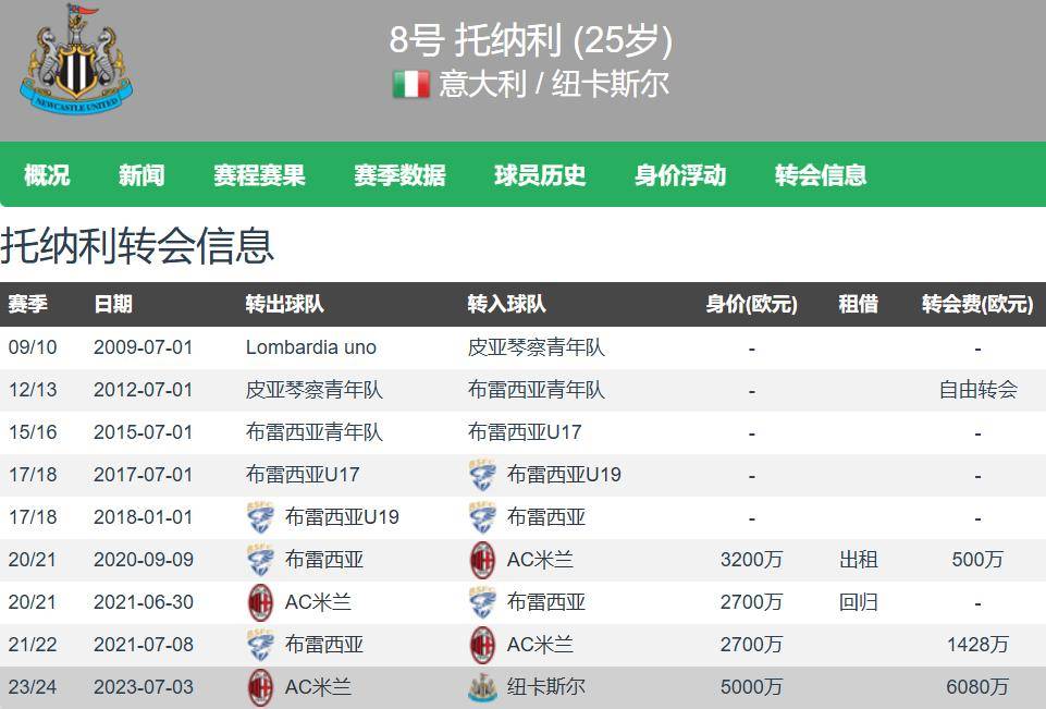 Tonali มาจากการฝึกเยาวชนของ Brescia ในปี 2020 ผู้เล่นเข้าร่วมกับเอซี มิลานด้วยค่าธรรมเนียมการโอน 5 ล้านยูโรในช่วงซัมเมอร์ปี 2020 จากนั้นจึงเช่าให้เบรสชาเพื่อเล่น ผู้เล่นกลายเป็นดาราเซเรียอาในมิลาน และในช่วงฤดูร้อนปี 2023 พวกเขาเข้าร่วมนิวคาสเซิลจากเอซี มิลานด้วยเงิน 60.8 ล้านยูโร