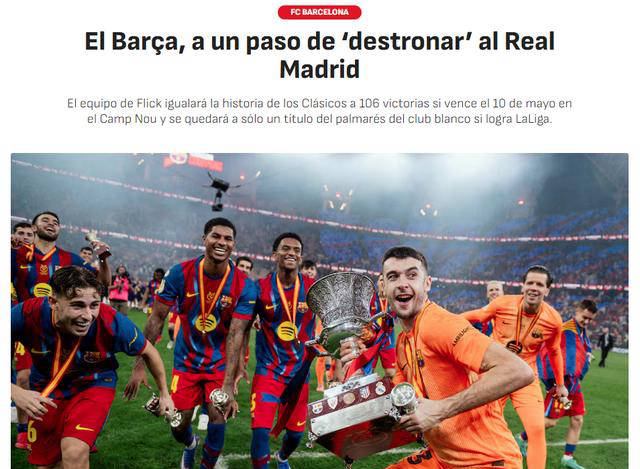 ขณะที่ถ้วยแชมป์ยังคงร้อนแรงขึ้น การแข่งขันของ "แชมป์ดาร์บี้แชมป์แห่งชาติ" นี้ ได้กลายเป็นเรื่องที่น่าตื่นเต้นมากขึ้นเรื่อยๆ สถิติแสดงให้เห็นว่าในเดือนพฤษภาคม บาร์เซโลนาจะก้าวไปสู่แชมป์เปี้ยนชิพที่ 104 ของประวัติศาสตร์ทีม ขณะที่เรอัล มาดริด ซึ่งว่างเปล่าทั้งสี่ในฤดูกาลนี้ หยุดนิ่ง และสถิติยังคงเป็น 105 แชมป์ ด้วยวิธีนี้ การแข่งขันฟุตบอลสเปนซูเปอร์คัพในเดือนมกราคม 2027 อาจกลายเป็นเวทีที่จะได้เห็นช่วงเวลาแห่งประวัติศาสตร์: หากบาร์เซโลนาคว้าแชมป์ได้ ถ้วยรางวัลทั้งหมดของสองทีมยักษ์ใหญ่จะสำเร็จร่วมกัน ซึ่งทั้งสองอย่างคือ 105 ถ้วยทอง! อำนาจอันมั่งคั่งที่ยาวนานในศตวรรษนี้จะต้องเขียนตำนานต่อไปอย่างแน่นอนในอนาคต