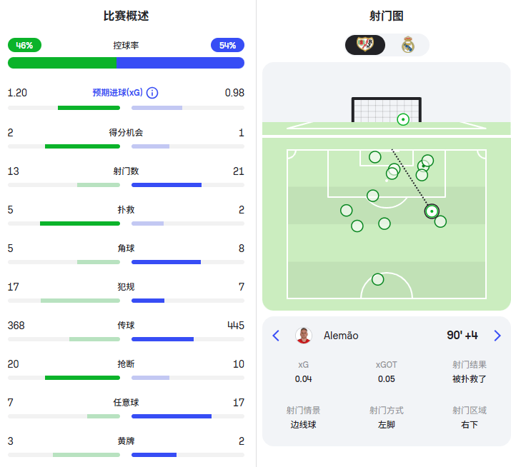 สถิติเปิดเผยว่า เรอัล เบติส มีค่าคาดการณ์ประตู (xG) อยู่ที่ 1.2 เมื่อเทียบกับ เรอัล มาดริด ที่มีค่า 0.98 ทำให้พวกเขามีความได้เปรียบ พวกเขายังสร้างโอกาสทำประตูที่ชัดเจนมากกว่าคู่แข่งหนึ่งครั้ง