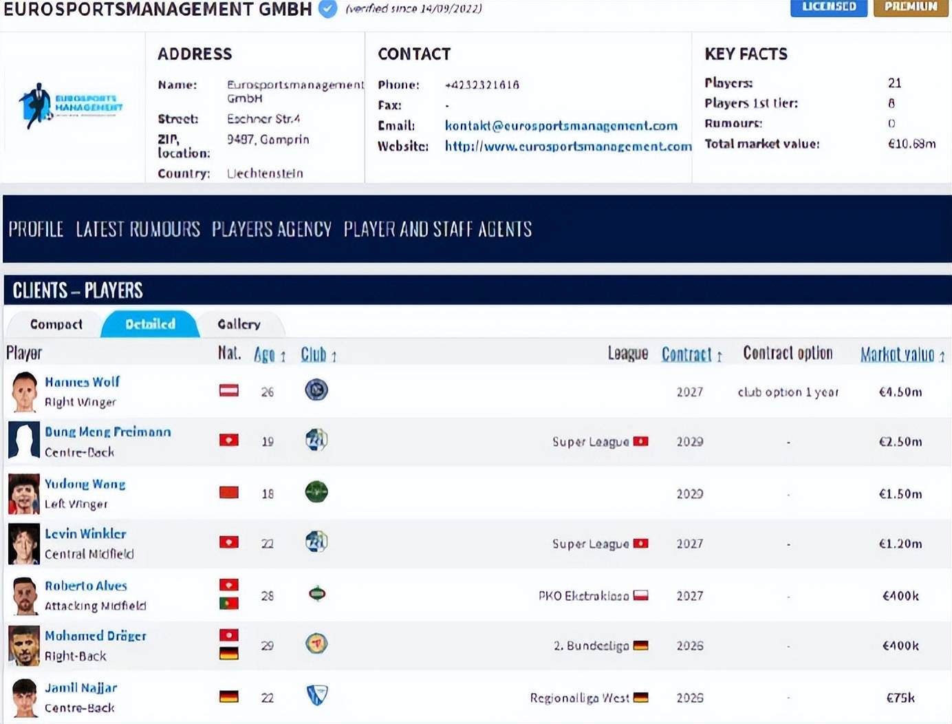 ผู้เล่นส่วนใหญ่ที่ EuroSportsManagement เป็นตัวแทนนั้นอยู่ในลีกเยอรมันและสวิตเซอร์แลนด์ โดยมีดาวเด่นอย่าง โรเบิร์ต เลวานดอฟสกี้, ชาด, ไบเออร์, คริโชเวียค และ เบริก ได้เซ็นสัญญากับเอเจนซี่นี้ โดยเฉพาะอย่างยิ่ง โรเบิร์ต เลวานดอฟสกี้ กองหน้าดาวเด่นของบาร์เซโลนาในปัจจุบัน ได้รักษาสัญญากับบริษัทนี้มาเป็นเวลาสิบปีตามการวิเคราะห์ของปาน เว่ยหลี่ การเซ็นสัญญากับหวัง หยูตงของพวกเขามีวัตถุประสงค์เพื่อใช้เขาเป็นตัวแทนประชาสัมพันธ์ ทำให้วงการฟุตบอลจีนและเอเชียคุ้นเคยกับเอเจนซีของพวกเขา ในขณะเดียวกันก็แนะนำหวังให้กับสโมสรในยุโรป โดยเฉพาะอย่างยิ่งในเยอรมนีและสวิตเซอร์แลนด์