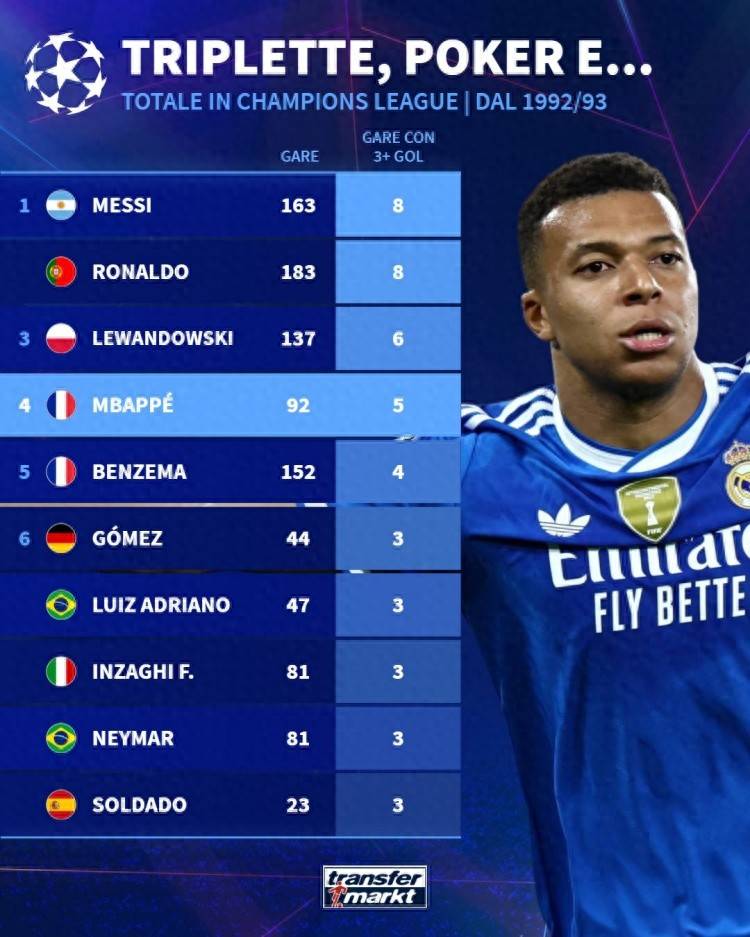 นับตั้งแต่มีการเปลี่ยนแปลงรูปแบบการแข่งขันยูฟ่าแชมเปียนส์ลีก การแข่งขันที่มีประตู 3 ลูกขึ้นไปต่อเกม: เมสซี่และโรนัลโด้นำเป็นอันดับหนึ่งด้วย 8 ประตู, เอ็มบัปเป้อยู่ในอันดับที่ 4 ด้วย 5 ประตู_ลีก_การย้ายทีม_ยุโรป