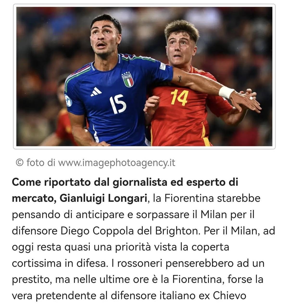 ตามรายงานจากนักข่าวการย้ายทีมและผู้เชี่ยวชาญ จานลุยจิ ลองการี ฟิออเรนตินาต้องการเอาชนะเอซี มิลานในการเซ็นสัญญากับกองหลังของไบรท์ตัน ดิเอโก โคโปลา สำหรับมิลาน เนื่องจากขาดแคลนผู้เล่นในตำแหน่งกองหลังอย่างหนัก การได้ตัวโคโปลาจึงยังคงเป็นเป้าหมายการย้ายทีมที่มีความสำคัญใกล้เคียงกับลำดับต้นๆรอสโซเนรีได้พิจารณาที่จะยืมตัวนักเตะรายนี้ในตอนแรก แต่ในช่วงไม่กี่ชั่วโมงที่ผ่านมา ดูเหมือนว่าฟิออเรนติน่าจะเป็นผู้สนใจตัวจริงสำหรับกองหลังชาวอิตาลีรายนี้ ซึ่งมีถิ่นกำเนิดจากเคียโว เวโรนา