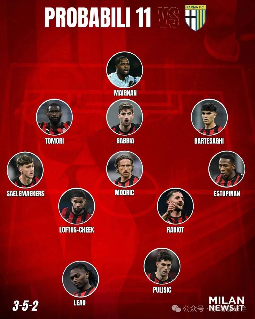 แบ็กขวา ซาเลมาร์กเกอร์ส กลับมาสู่รายชื่อผู้เล่นตัวจริงอีกครั้งหลังจากฟื้นตัวจากอาการบาดเจ็บ ขณะที่แบ็กซ้าย เอสตูปินาน อาจถูกใช้งานอีกครั้งแม้จะมีผลงานต่ำกว่ามาตรฐานในเกมล่าสุดที่พบกับปาร์มาอย่างไรก็ตาม Bartschagi มีแนวโน้มที่จะไม่ได้พัก เขาจะเข้ามาแทนที่ Pavlović ในตำแหน่งเซ็นเตอร์แบ็คฝั่งซ้าย ทำให้ Dewinter ได้พัก ในแดนหน้า Nkunku, Leão และ Pulisic กำลังแย่งชิงตำแหน่งตัวจริงสองตำแหน่ง โดย Leão และ Pulisic กำลังได้รับความสนใจให้จับคู่กันในแดนหน้า