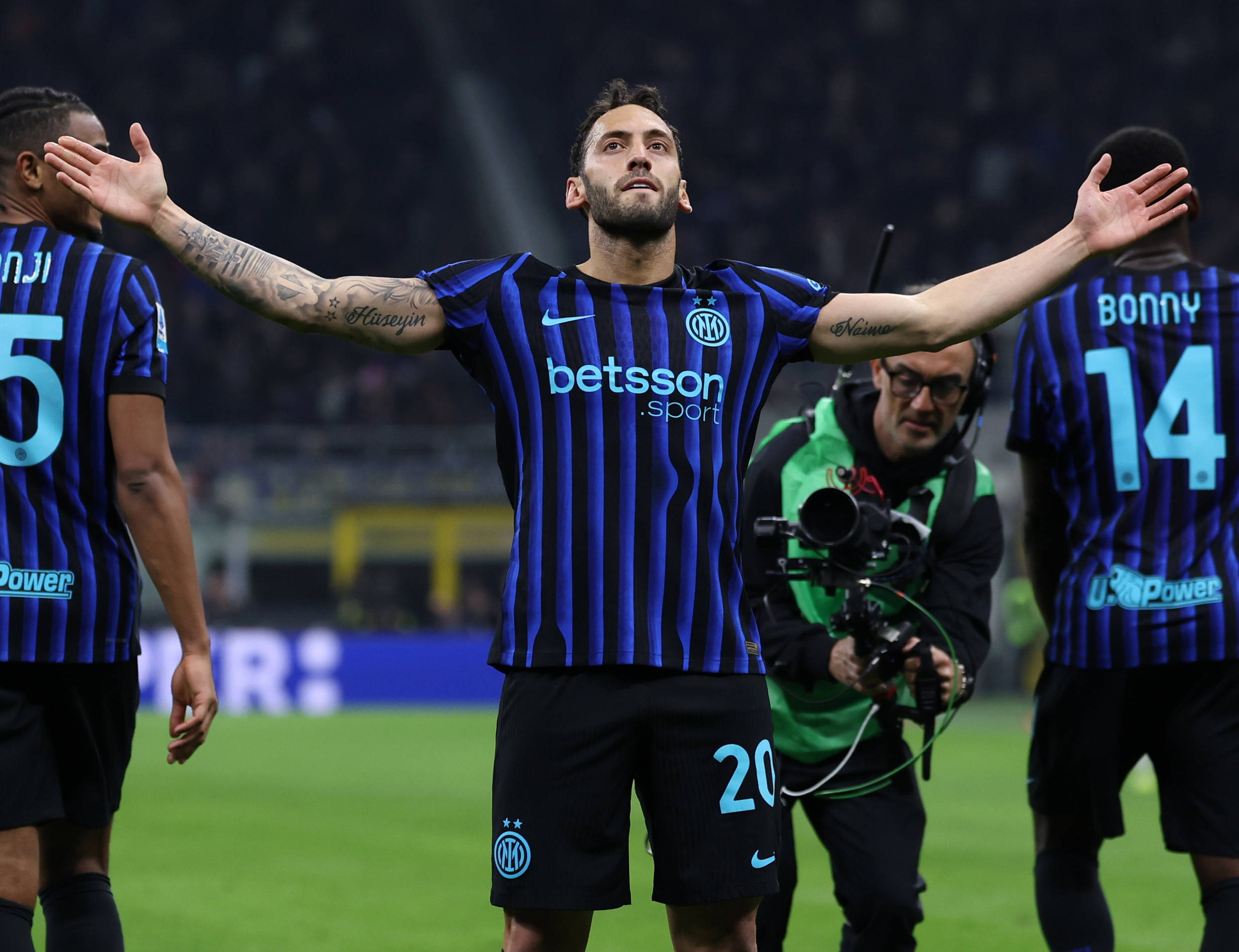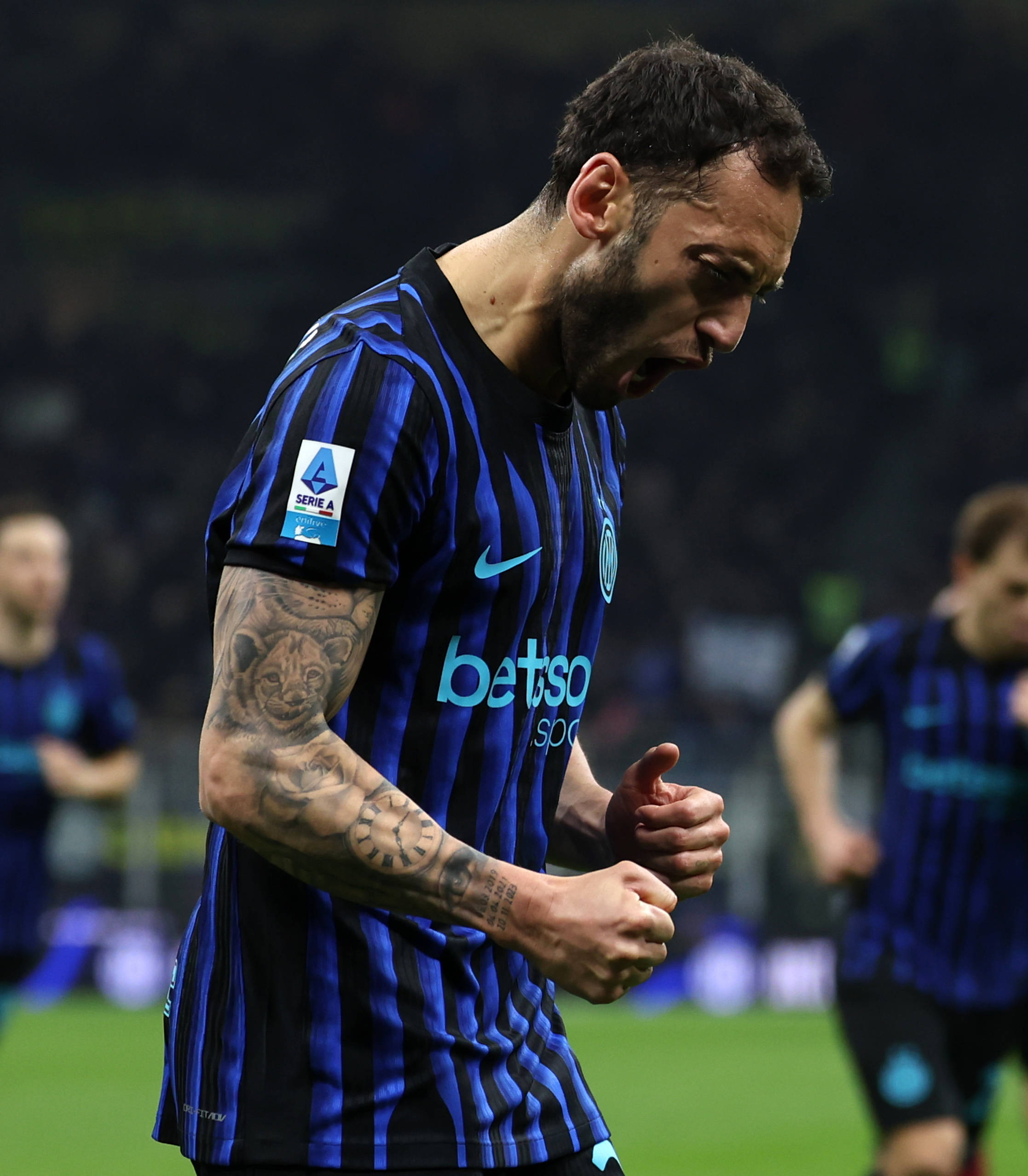 เมื่อวันที่ 28 กุมภาพันธ์ ฮาคาน ชัลฮาโนกลู นักเตะของอินเตอร์ มิลาน ฉลองการทำประตูระหว่างการแข่งขัน สำนักข่าวซินหัว
