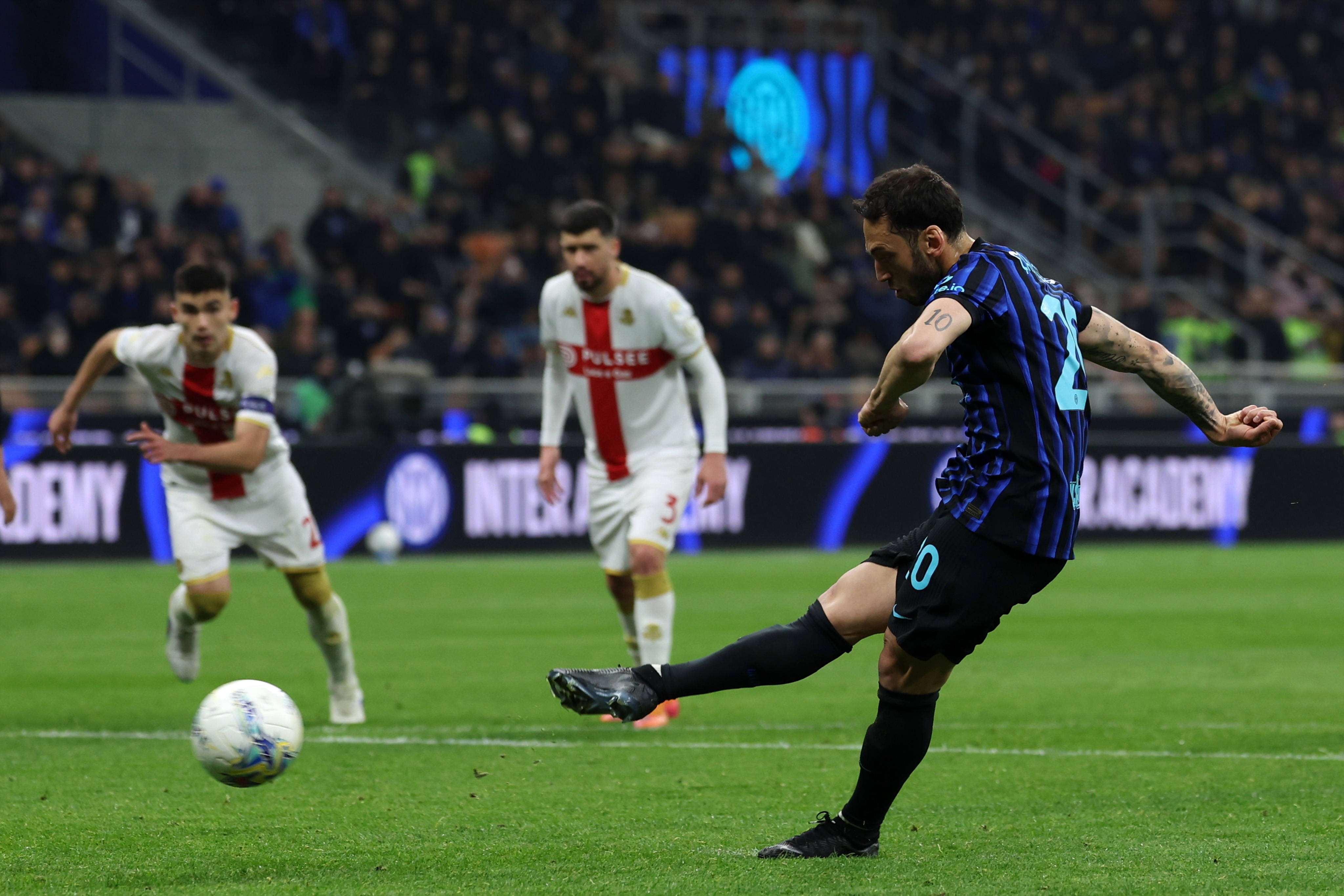 เมื่อวันที่ 28 กุมภาพันธ์ ฮาคาน ชัลฮาโนกลู (ขวา) นักเตะของอินเตอร์ มิลาน ยิงจุดโทษเข้าประตูระหว่างการแข่งขัน สำนักข่าวซินหัว