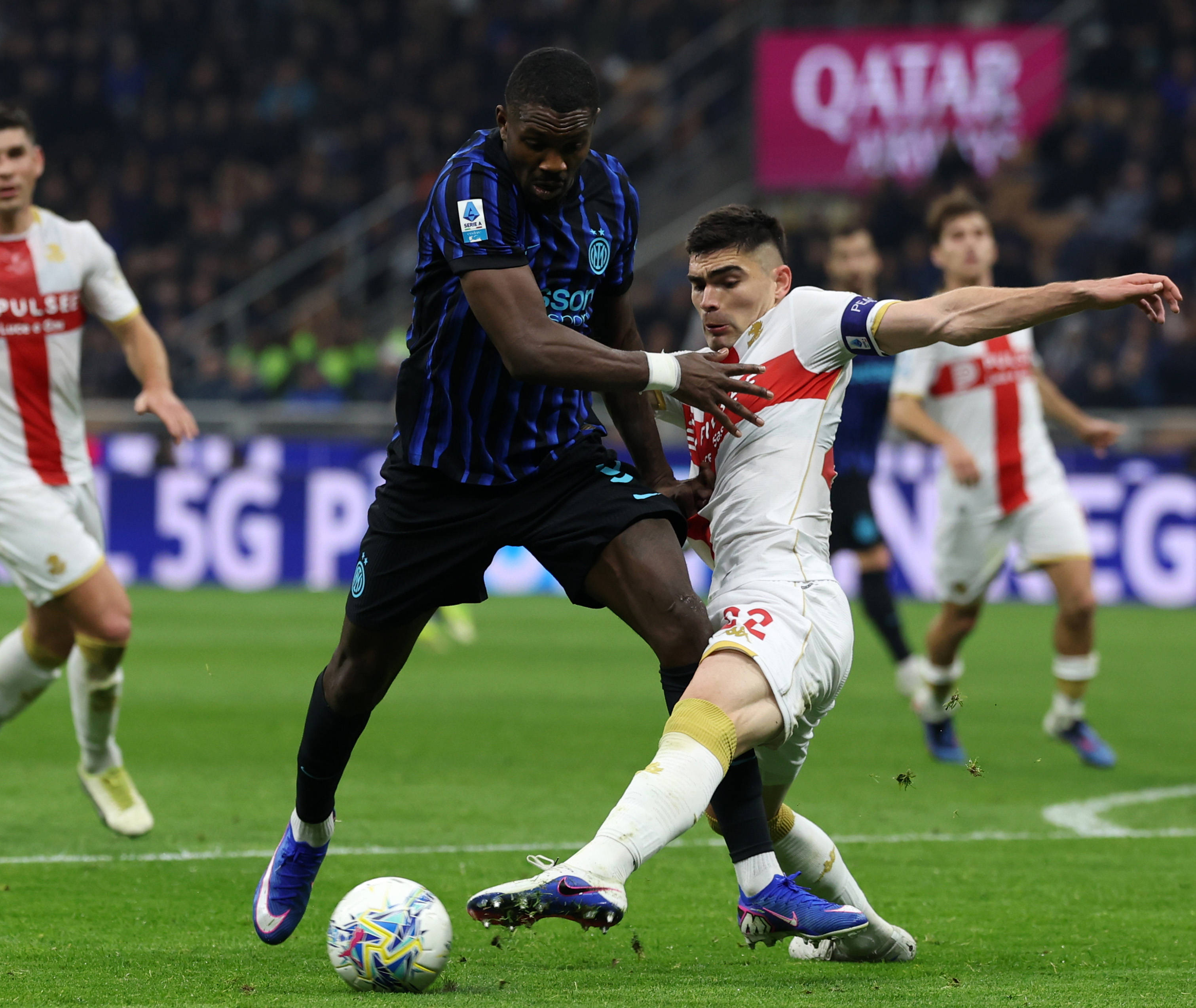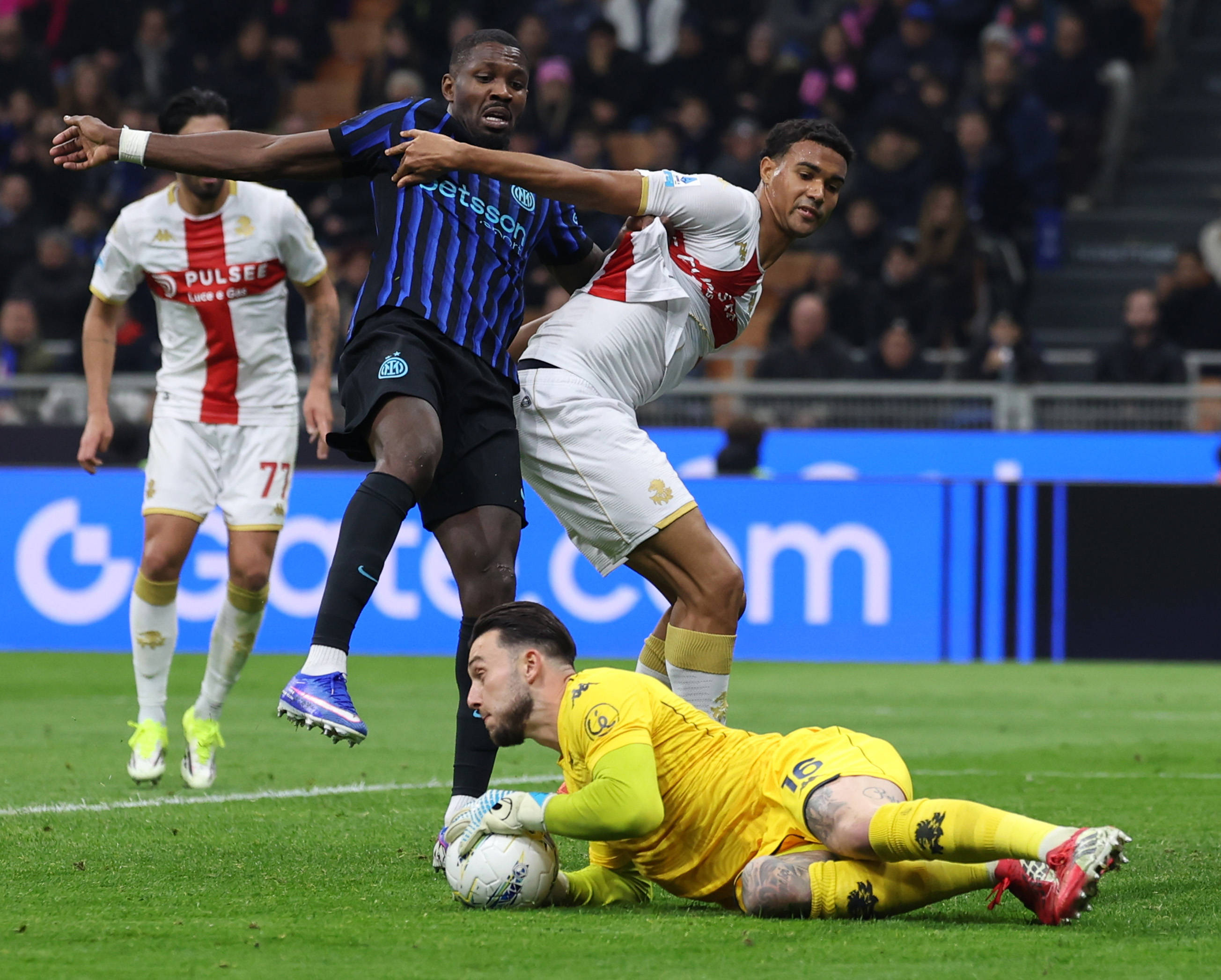 เมื่อวันที่ 28 กุมภาพันธ์ ลิลิยอง ตูราม ของอินเตอร์ มิลาน (ซ้าย) เข้าปะทะกับ ฮวน ปาโบล บาสเกซ ของเจนัว ระหว่างการแข่งขัน สำนักข่าวซินหัว