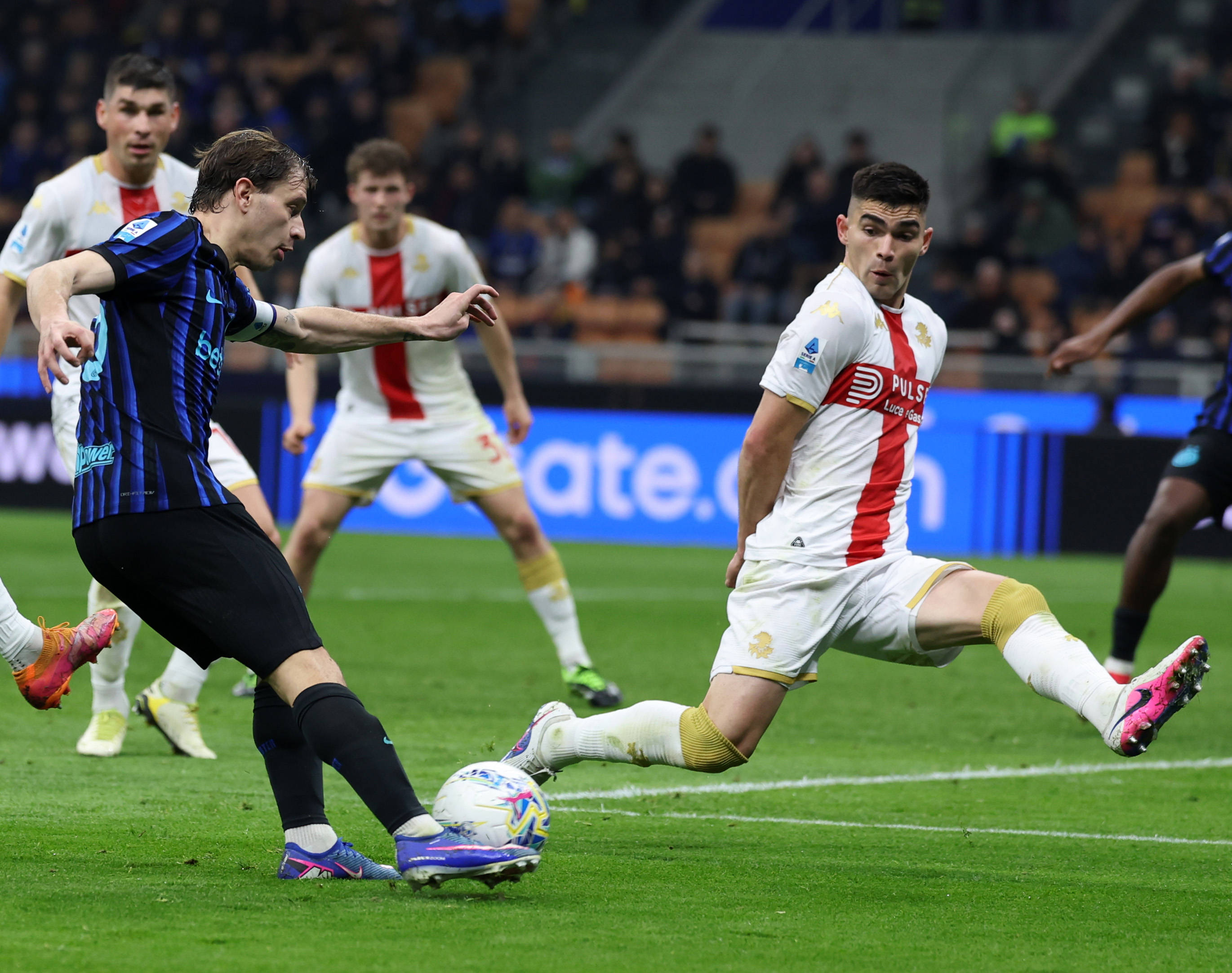 เมื่อวันที่ 28 กุมภาพันธ์ นิโคโล่ บาเรลล่า (ซ้าย) ของอินเตอร์ มิลาน เข้าปะทะกับ อโมลิน ของเจนัว เพื่อแย่งบอลระหว่างการแข่งขัน สำนักข่าวซินหัว