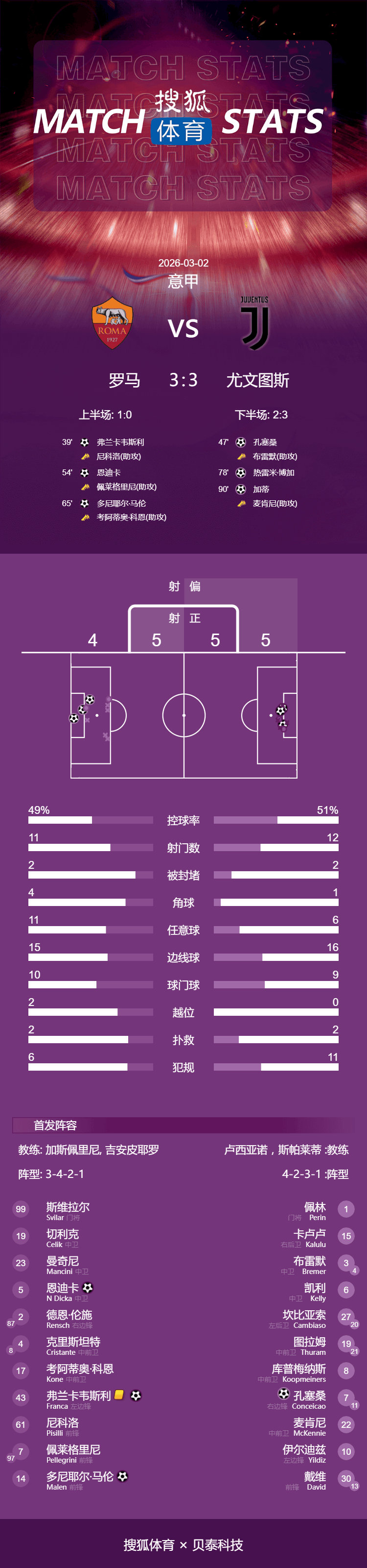 เวลา 03:45 น. ตามเวลาปักกิ่ง วันที่ 2 มีนาคม โรม่าเปิดบ้านต้อนรับยูเวนตุสที่สนามสตาดิโอ โอลิมปิโก ในรอบที่ 27 ของฤดูกาลเซเรียอา 2025/26 ก่อนเริ่มการแข่งขัน โรม่าอยู่ในอันดับที่สี่ ขณะที่ยูเวนตุสอยู่ในอันดับที่หก หลังจากพลาดโอกาสหลายครั้งในครึ่งแรก ฟลานาแกน เวสลีย์ ทำประตูแรกให้กับทีมเจ้าบ้านครึ่งหลังเกิดการเปลี่ยนแปลงอย่างดุเดือดเมื่อทั้งสองทีมผลัดกันทำประตูอย่างรวดเร็ว โดยมีการทำประตูถึงห้าประตูระหว่างทั้งสองทีม โรม่าขึ้นนำ 3-1 ชั่วครู่ก่อนที่ยูเวนตุสจะสู้กลับอย่างดุเดือดจนตีเสมอได้ จบเกมด้วยผลเสมอ 3-3 ทำให้ทั้งสองทีมได้ทีมละหนึ่งคะแนน และทำให้ตารางคะแนนในลีกยังคงสูสีกันอย่างมาก