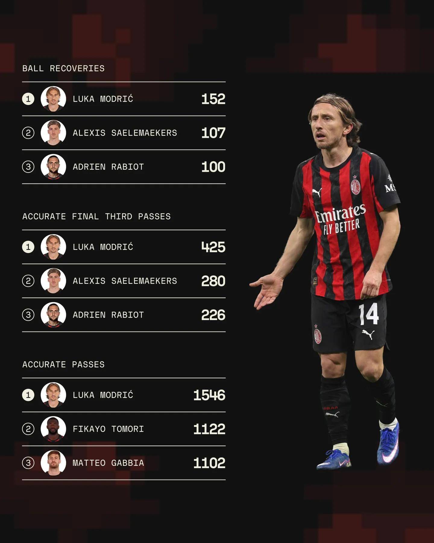 สถิติแสดงให้เห็นว่าคะแนนเฉลี่ยของกัลโช่ (7.6 คะแนน), จ่ายคีย์ (47 ครั้ง), สิทธิที่ได้รับ (152 ครั้ง) และสามครั้งที่ถูกต้องของการโจมตีสามเขต (425 ครั้ง) และการจ่ายบอลสำเร็จ (1546 ครั้ง) สูงสุดในมิลาน นอกจากนี้ยังสร้างโอกาสสำคัญทั้งหมด 6 อันดับ อันดับสองในทีมรองลงมาคือลีโอเพียง 7 ครั้งเท่านั้น