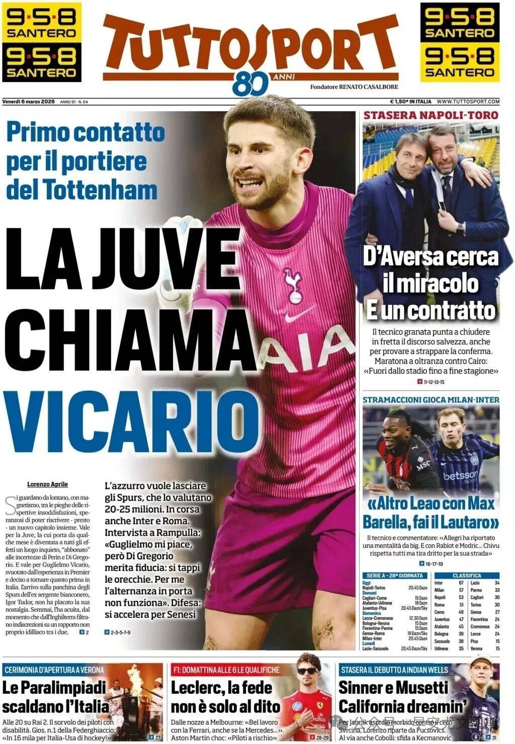 Bianconeri เป็นหนึ่งในสโมสรที่สนใจในท็อตแนมผู้รักษาประตู Vicario ตามรายงานของ "ตูริน สปอร์ต เดลี่" ยูเวนตุส ได้มีการเจรจาเบื้องต้นกับตัวแทนของนักเตะอิตาลีแล้ว