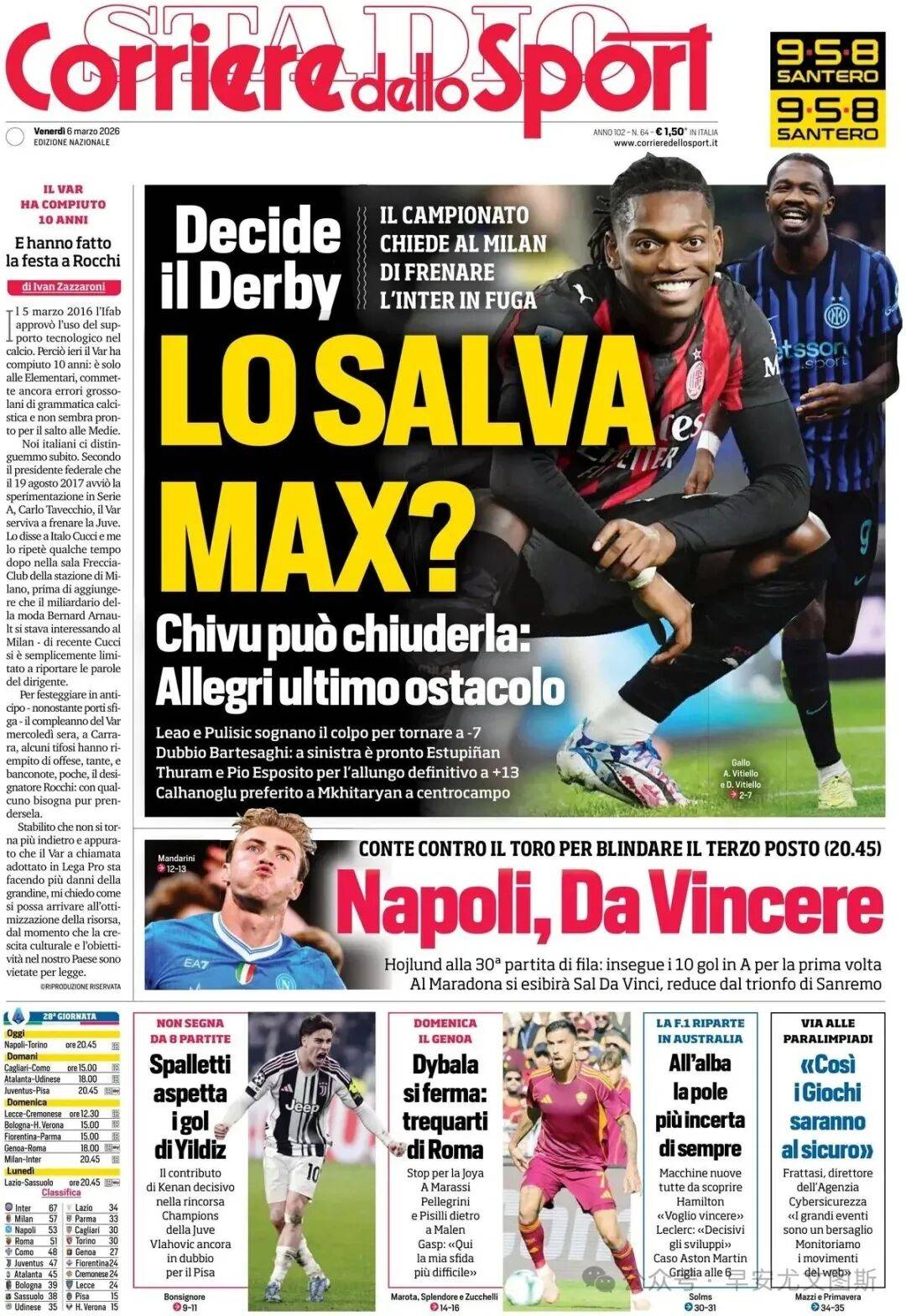 1. ดาร์บี้มิลานดาร์บี้ผู้แน่วแน่ช่วยเซเรียอา? ลีกขอให้มิลานหยุดฝุ่นไม่ให้อินเตอร์ Ziwo อาจล็อคในการแข่งขันชิงแชมป์: Allegri เป็นอุปสรรคสุดท้าย ลีโอและพูลิซิชฝันถึงการโต้กลับห่างออกไปเพียง 7 แต้ม และซาจิผู้ร้ายก็สงสัย: เอสตูปิแนนพร้อมแล้ว Tulam และ Pio Espolito หวังที่จะขยายความเป็นผู้นำเป็น 13 คะแนน ในตำแหน่งกลางสถานที่ Charhan Olubim Hitlian มีแนวโน้มที่จะเริ่มต้นมากขึ้น