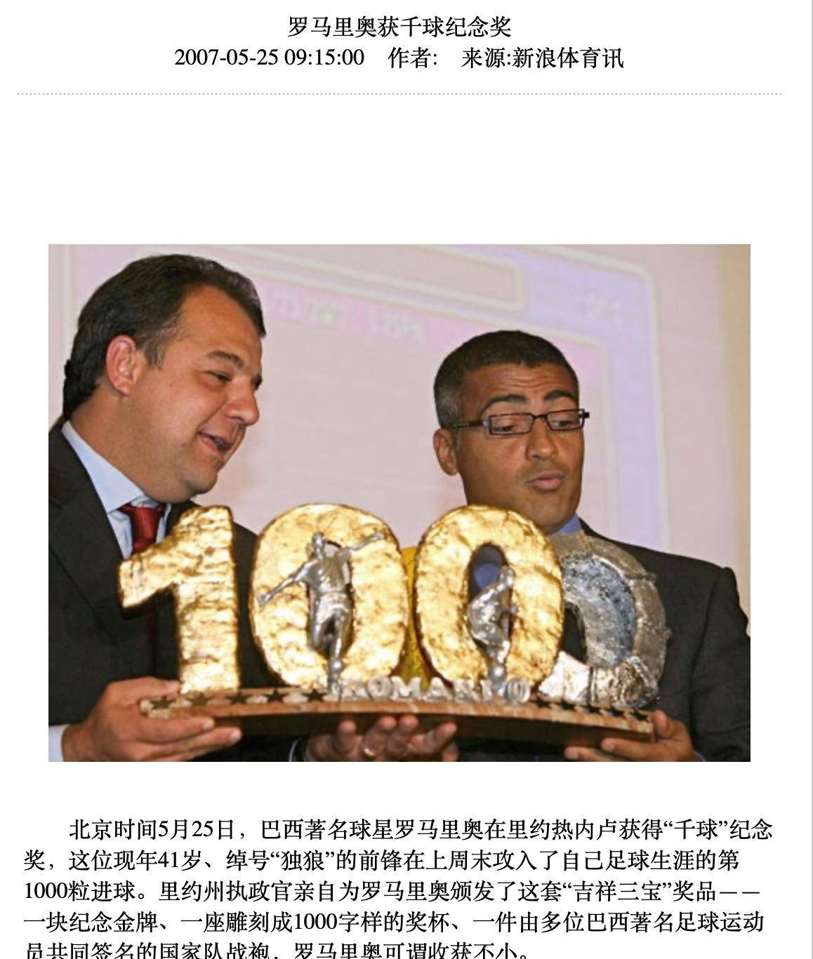 โรมาริโอ ตำนานแห่งอเมริกาใต้ที่มีชื่อเล่นว่า "หมาป่าเดียวดาย" ประสบความสำเร็จในอาชีพ 1,000 ลูก เร็วที่สุดเท่าที่ 20 พฤษภาคม 2550 เมื่ออายุได้ 41 ปี เขาจบช่วงเวลาแห่งประวัติศาสตร์นี้ด้วยการเตะลูกโทษในลีก PA และทั้งเกมถูกขัดจังหวะเป็นเวลา 20 นาทีเต็มเพื่อเฉลิมฉลองความสำเร็จอันน่าทึ่งนี้ ในเวลานั้น สนามกีฬา Maracana กำลังเดือดเหมือนไฟ และสิ่งที่น่าประทับใจยิ่งกว่านั้นก็คือสื่อของบราซิลรายใหญ่ได้เปิดตัวรายการพิเศษที่ระลึก และโอกาสอันยิ่งใหญ่ได้เห็นความรุ่งโรจน์ของนักแม่นปืนรุ่นหนึ่ง CCTV, Xinhuanet, Dazhong.com และสื่ออื่น ๆ ของรัฐมีรายงานที่เข้มข้นซึ่งบันทึกช่วงเวลาประวัติศาสตร์นี้ที่น่าจดจำ