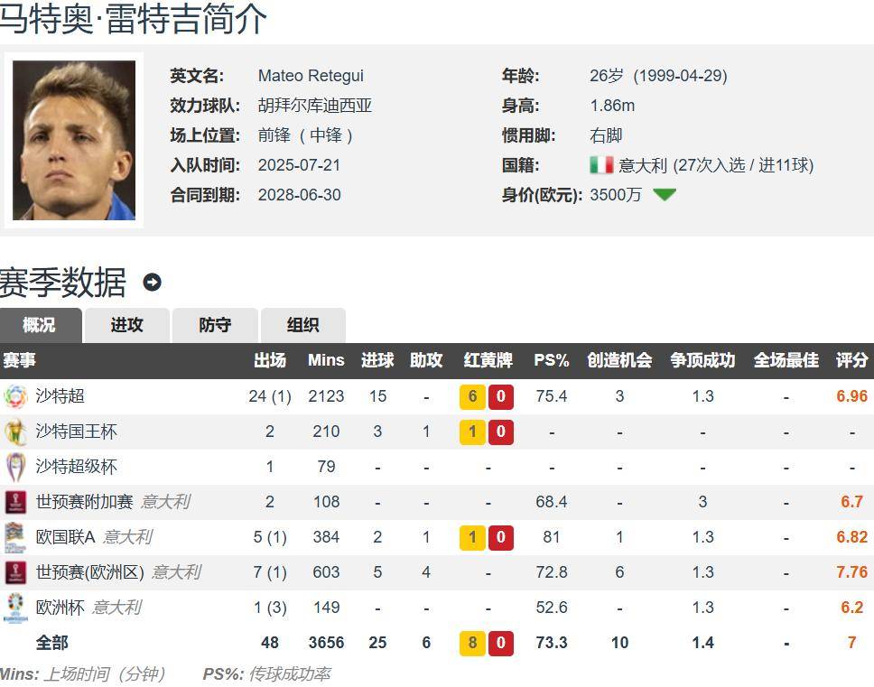 Retgi ซึ่งมีอายุประมาณ 27 ปี สูง 1.86 เมตร โดยมีศูนย์เท้าขวา และการย้ายทีมของเยอรมันนั้นอยู่ที่ประมาณ 35 ล้านยูโร ฤดูกาลนี้เขาเล่นให้กับ Hubairkodesia 28 ครั้งโดยทำประตูได้ 18 ประตูและ 1 แอสซิสต์ ในจำนวนนั้น ซาอุดีอาระเบียมี 15 ประตูจาก 25 เกมและ 15 ประตูในรายชื่อผู้ทำประตู อาชีพอิตาลี 11 ประตูและ 5 แอสซิสต์จาก 27 เกม