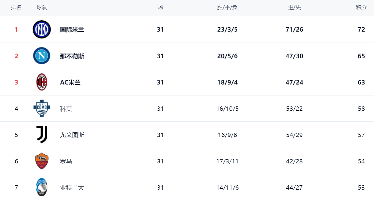 ในอันดับ อินเตอร์ มิลาน อันดับหนึ่ง ด้วยสถิติชนะ 23 ครั้ง เสมอ 3 แพ้ 5 และได้ 72 แต้ม นำหน้าไปไกล เนเปิลส์ซึ่งอยู่ในอันดับที่สองคือ 65 คะแนน 7 แต้มตามหลังอินเตอร์มิลาน เอซี มิลาน ที่แพ้ ยังได้ 63 แต้ม ล้มไปครองอันดับ 3 ตามหลัง อินเตอร์ มิลาน 9 แต้ม และยังมีความหวังในการคว้าแชมป์น้อย โคโมอยู่ในอันดับที่ 4 ด้วยคะแนน 58 คะแนน หลังจากยูเวนตุสชนะคะแนนรวมถึง 57 คะแนน อันดับ 5 ห่างเพียง 1 แต้มจากแชมเปี้ยนส์ลีก โรมอยู่ในอันดับที่ 6 ด้วยคะแนน 54 คะแนน แอตแลนต้า 53 แต้ม อันดับที่ 7