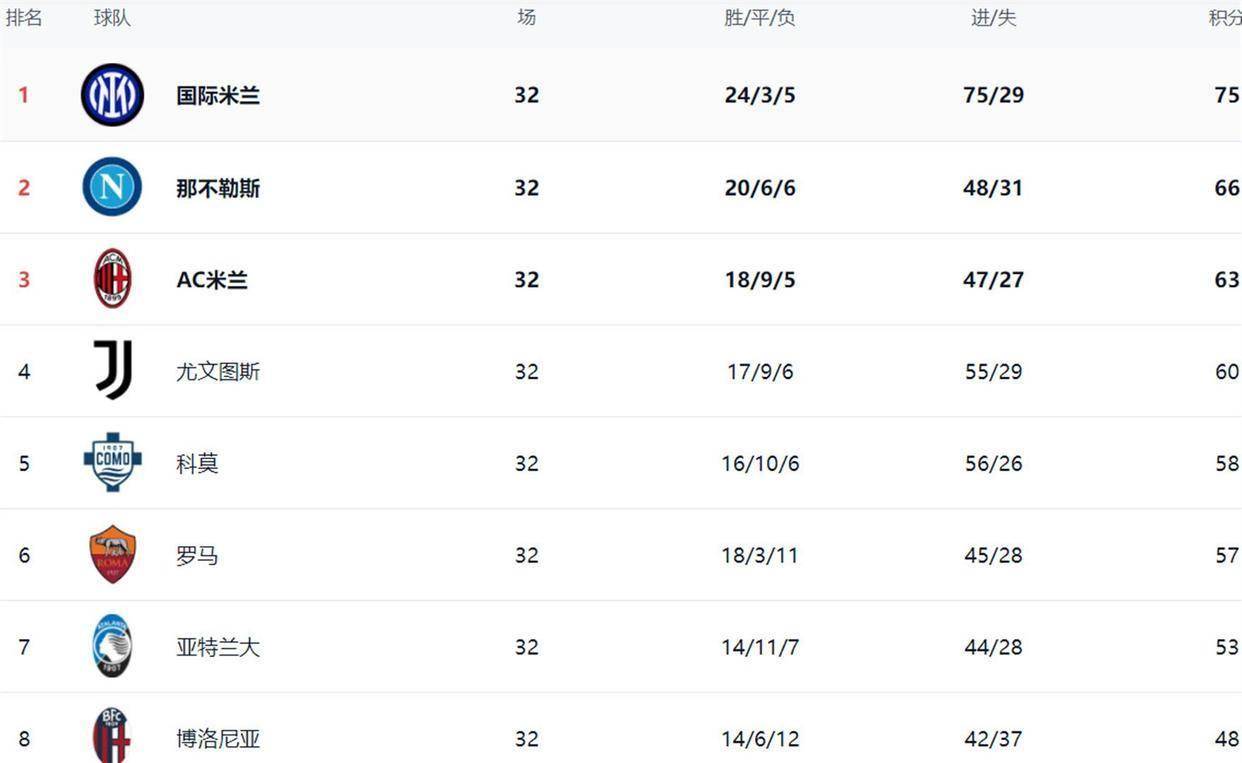 อินเตอร์ มิลาน ผู้ชนะการพลิกกลับที่น่าตกใจ มีชัยชนะ 24 ครั้ง เสมอ 3 เสมอ และแพ้ 5 นัดหลังจาก 32 รอบ และคะแนนได้ถึง 75 แต้ม และยังคงนั่งอยู่ในอันดับต้น ๆ ของรายการต่อไป