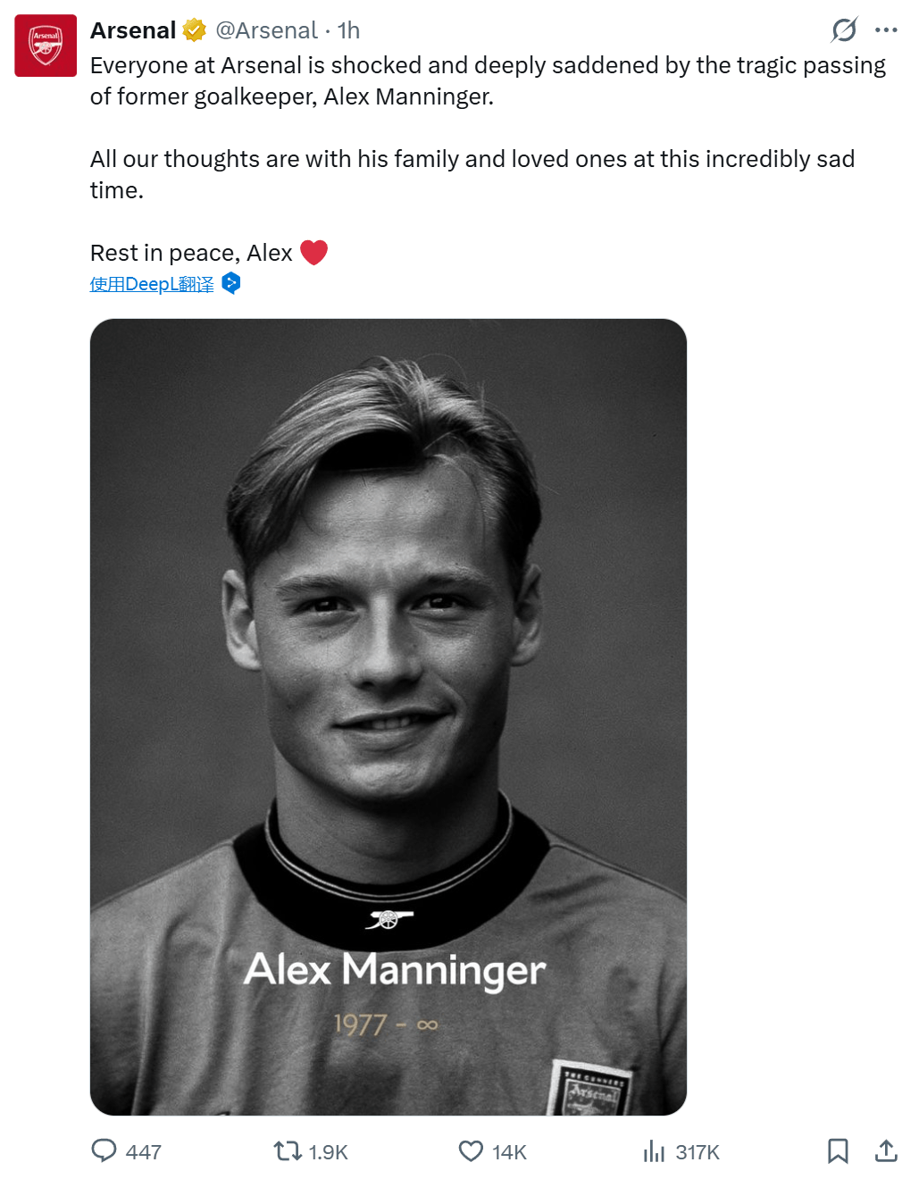 โซเชียลมีเดียอย่างเป็นทางการของสโมสรเช่น Arsenal และ Juventus ได้ตีพิมพ์บทความทีละรายการเพื่อเป็นการไว้อาลัยอย่างสุดซึ้งต่อการจากไปของอดีตผู้รักษาประตู Alexander Manninger