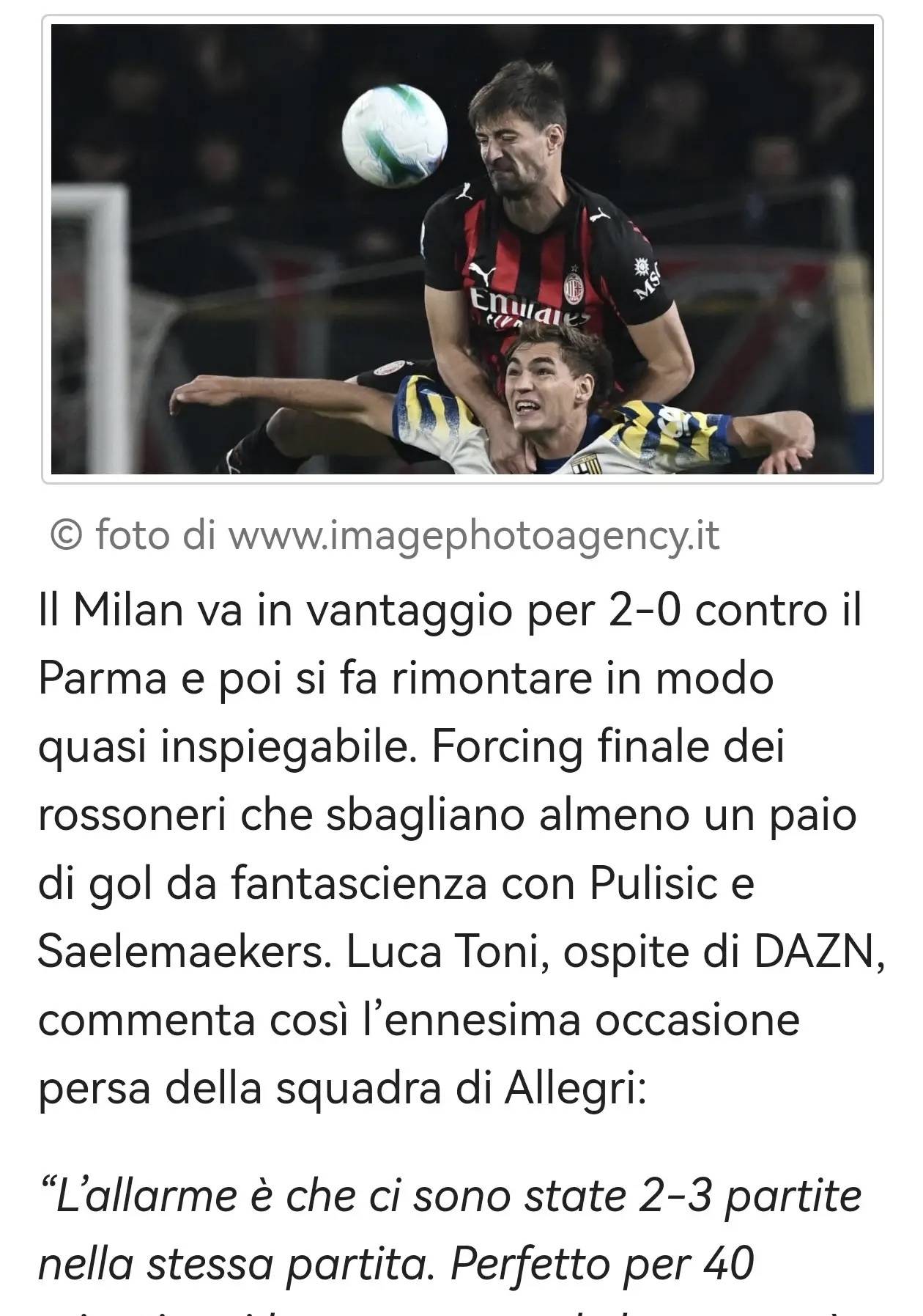 เอซี มิลาน เคยนำปาร์มา 2-0 แต่กลับถูกตีเสมอในแบบที่แทบอธิบายไม่ได้ ทีมรอสโซเนรีเปิดฉากโจมตีอย่างดุเดือดในช่วงท้ายเกม แต่ปูลิซิชและซาเลมาเกอร์สพลาดโอกาสทองอย่างน้อยสองครั้ง ทำให้ผู้เล่นมิลานต้องออกจากสนามด้วยความผิดหวัง! ในฐานะแขกรับเชิญพิเศษของ DAZN ลูก้า โทนี่ ได้แสดงความคิดเห็นเกี่ยวกับทีมของอัลเลกรีที่พลาดโอกาสอีกครั้งว่า: