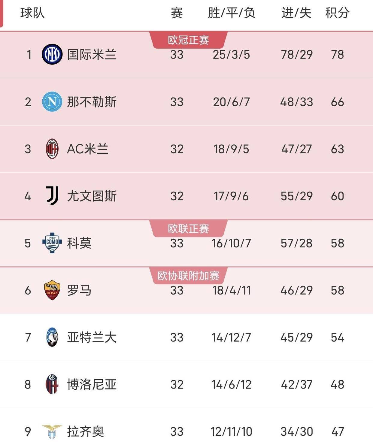 ตั้งแต่วันที่ 18 ถึง 19 เมษายน ตามเวลาปักกิ่ง รอบที่ 33 ของเซเรีย อา ได้จัดการแข่งขันครั้งสำคัญหลายรายการที่เพียงพอสำหรับเปลี่ยนฤดูกาล ผู้นำอินเตอร์ มิลาน เอาชนะ คาลียรี 3-0 ในบ้าน เพิ่มคะแนนเป็น 78 แต้ม