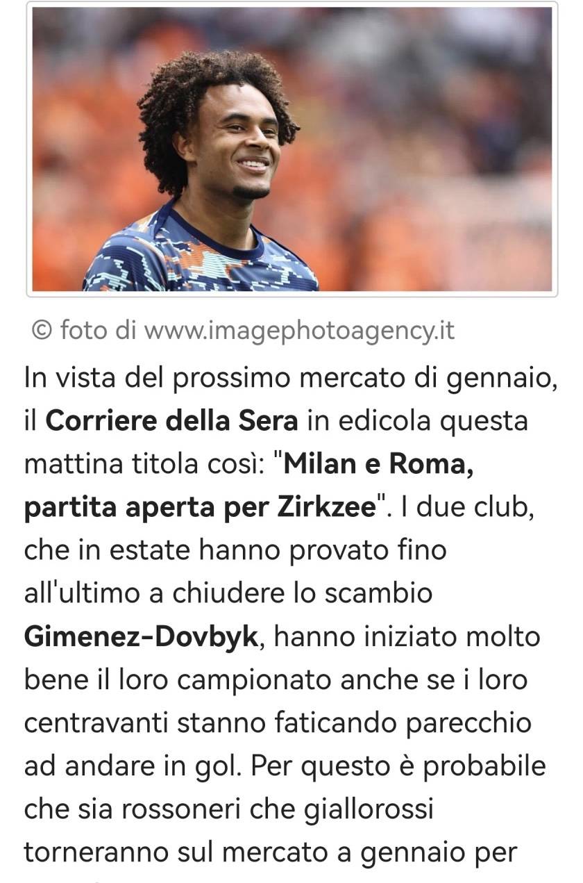 ตลาดซื้อขายนักเตะเดือนมกราคมกำลังใกล้เข้ามาทุกที โดยวันนี้ Corriere della Sera รายงานข่าวใหญ่ว่า "มิลานและโรม่าแย่งชิงซิร์คซี ความตื่นเต้นยังคงอยู่" ทั้งสองสโมสรได้พยายามอย่างหนักในการเจรจาแลกเปลี่ยนนักเตะระหว่างเจซุสและดูวิคในช่วงซัมเมอร์ที่ผ่านมา และแม้ว่าฤดูกาลของพวกเขาจะเริ่มต้นได้อย่างน่าพอใจ แต่กองหน้าของพวกเขาก็ยังไม่สามารถทำประตูได้มากมายนัก ด้วยเหตุนี้ มิลานและโรม่าจึงมีความเป็นไปได้สูงที่จะตามหาตัวเลือกใหม่ในตำแหน่งกองหน้าอีกครั้งในตลาดซื้อขายนักเตะเดือนมกราคม