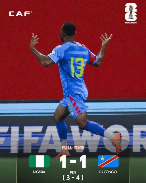 ในรอบชิงชนะเลิศของการแข่งขันเพลย์ออฟคัดเลือกฟุตบอลโลกโซนแอฟริกา ซึ่งสิ้นสุดลงเมื่อวันที่ 17 พฤศจิกายน ตามเวลาปักกิ่ง ไนจีเรียและสาธารณรัฐประชาธิปไตยคองโกได้แข่งขันกันอย่างดุเดือด หลังจาก 120 นาทีของการต่อสู้ที่เข้มข้น เกมจบลงด้วยผลเสมอ 1-1 ในการดวลจุดโทษที่ตามมา ไนจีเรียพ่ายแพ้ต่อสาธารณรัฐประชาธิปไตยคองโกด้วยคะแนน 3-4 ส่งผลให้แพ้ด้วยสกอร์รวม 4-5 ด้วยเหตุนี้ พวกเขาจึงไม่สามารถผ่านเข้ารอบเพลย์ออฟระหว่างทวีปและพลาดโอกาสเข้าร่วมการแข่งขันฟุตบอลโลกในสหรัฐอเมริกา แคนาดา และเม็กซิโก