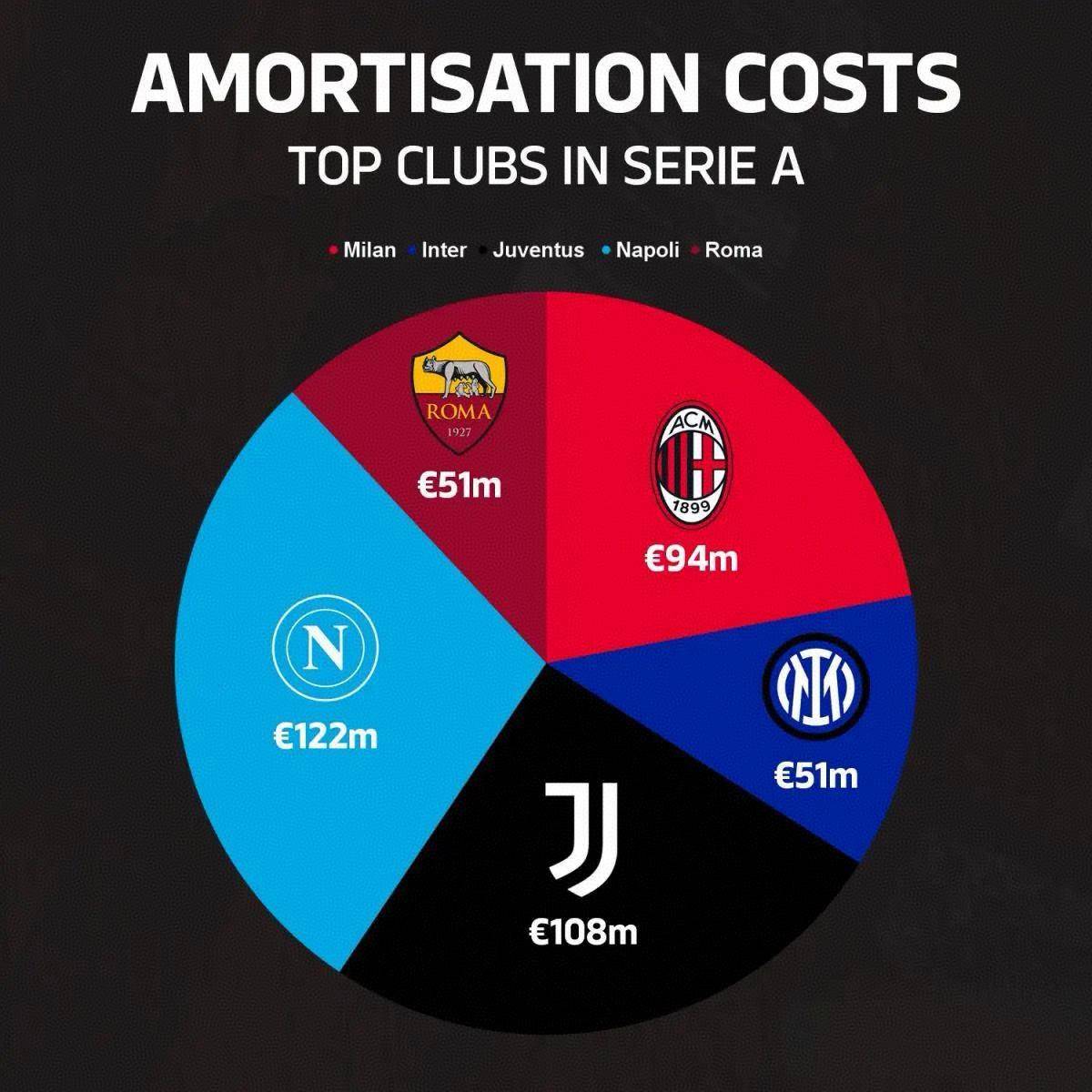 สโมสรในเซเรียอาที่มีค่าใช้จ่ายในการตัดจำหน่ายสูงสุดคือ นาโปลี ซึ่งสูงถึง 122 ล้านยูโร สาเหตุหลักมาจากการเซ็นสัญญานักเตะในช่วงสามตลาดซื้อขายที่ผ่านมา รวมถึง บูโอนอร์โจ, แม็คโทมิเนย์, ลูคาคู, เนเรส, บิคาคชิ และโนลายูเวนตุสอยู่ในอันดับที่สองด้วยค่าใช้จ่ายในการตัดจำหน่ายรายปีจำนวน 108 ล้านยูโร ซึ่งส่วนใหญ่เกิดจากการเซ็นสัญญากับนักเตะอย่าง คูปเมเนส, ดักลาส ลุยซ์, ฌอง กอนเซเซา และกอนซาเลซ อินเตอร์ มิลาน มีค่าใช้จ่ายในการตัดจำหน่ายรายปีอยู่ที่ 51 ล้านยูโร – เพียง 54% ของตัวเลขของมิลาน – โดยมีการลงทุนอย่างมากในนักเตะอย่าง ฟรัตเตซี และบอนนี