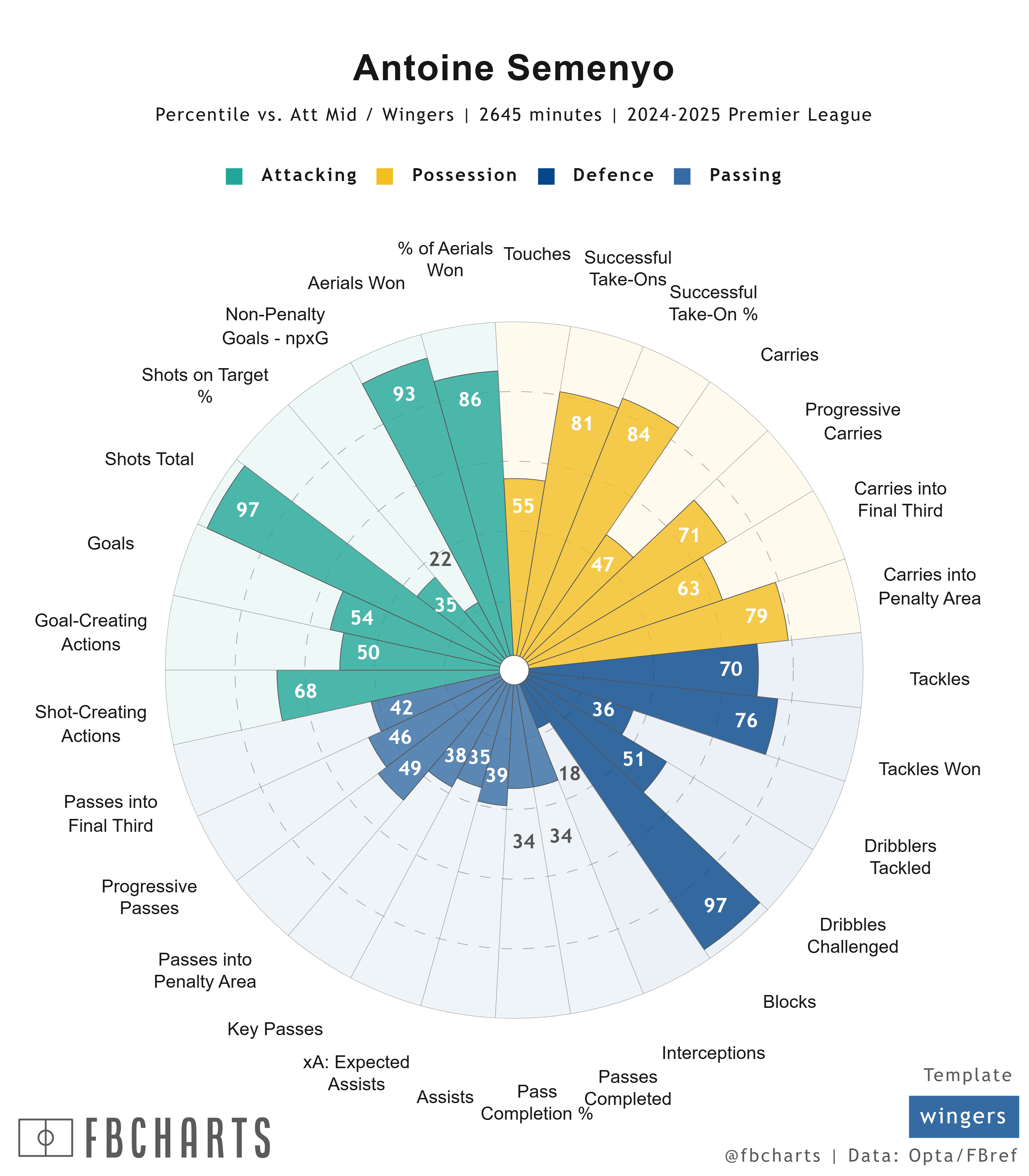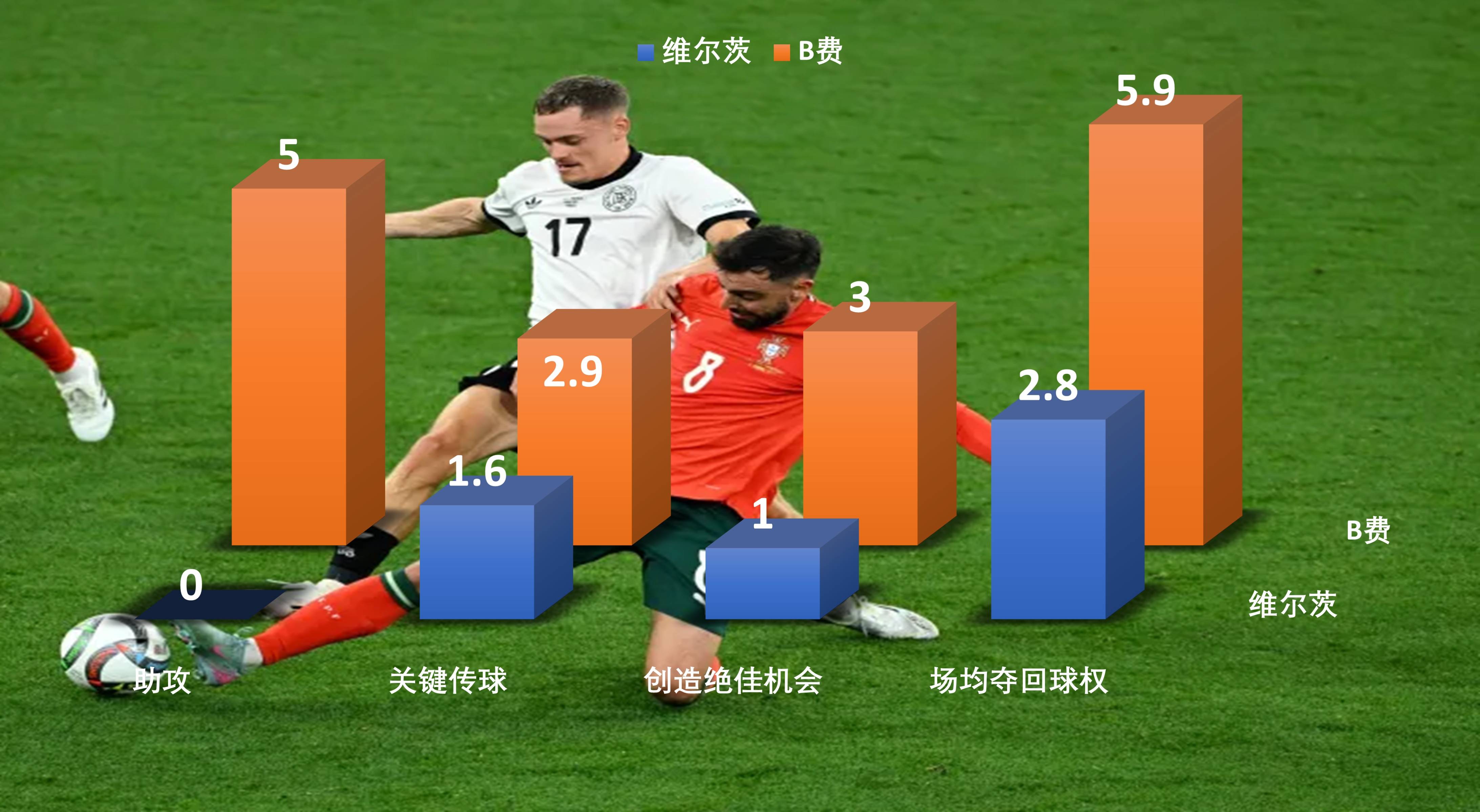 บี เฟอร์นันเดส สร้างโอกาสทำประตูที่เหนือกว่าอย่างมาก ส่งบอลสำคัญและแอสซิสต์มากกว่าวิร์ตซ์อย่างมีนัยสำคัญ และทำบอลได้มากกว่าวิร์ตซ์ถึงสองเท่าต่อเกม ผลกระทบของเขาทั้งในเกมรุกและเกมรับนั้นมากกว่าวิร์ตซ์อย่างเห็นได้ชัด