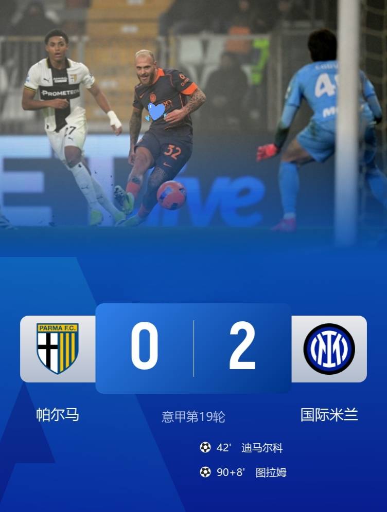 เวลา 03:45 น. ตามเวลาปักกิ่ง วันที่ 8 มกราคม ปาร์มาเปิดบ้านต้อนรับการมาเยือนของอินเตอร์ มิลาน ในรอบที่ 19 ของเซเรีย อา เนรัซซูรีคว้าชัยชนะนอกบ้านเหนือปาร์มา 2-0 ด้วยประตูในช่วงทดเวลาบาดเจ็บจากดิมาร์โกและด'อัมโบรซิโอ ทำให้พวกเขาเก็บสามแต้มเต็มและขยายสถิติชนะติดต่อกันในลีกเป็นหกนัดรวด ขณะที่พวกเขากำลังไล่ล่าแชมป์อย่างเต็มที่