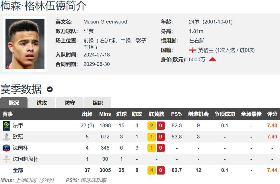 กรีนวูดอายุ 24 ปี และสูง 1.81 เมตร ผู้เล่นที่มีเท้าซ้ายและขวาสามารถเปิดคันธนูซ้ายและขวาได้ ส่วนใหญ่อยู่ในตำแหน่งปีกขวา และยังสามารถเล่นกองหน้าหรือกองหน้าคนที่สองได้อีกด้วย สัญญากับมาร์กเซยจะอยู่ที่ประมาณ 50 ล้านยูโรภายในปี 2572 กรีนวูดยังคงรักษาสถานะที่ดีของฤดูกาลที่แล้ว ฤดูกาลนี้เขามี 15 ประตู 4 แอสซิสต์ 24 เกมลีกเอิง 1 เกม 3 ประตู และ 1 แอสซิสต์ 8 เกม 4 นัด เฟรนช์ คัพ 6 ประตู และ 3 แอสซิสต์ 1 เฟรนช์ ซูเปอร์ คัพ รวม 37 เกม 25 ประตู และ 8 แอสซิสต์ 37 เกมในการแข่งขันต่างๆ