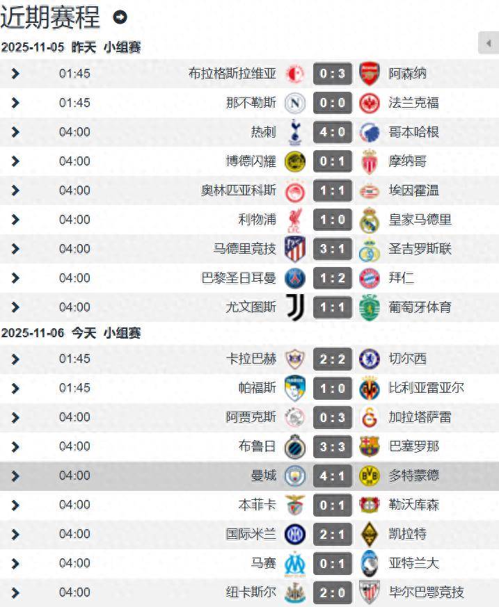 เวลา 00:00 น. ตามเวลาปักกิ่ง วันที่ 6 พฤศจิกายน การแข่งขันรอบแบ่งกลุ่มแชมเปียนส์ลีก รอบที่สี่ ได้สิ้นสุดลงแล้ว โดยมีการแข่งขันทั้งหมด 9 นัดในการแข่งขันยูฟ่าแชมเปียนส์ลีกครั้งนี้ ทีมจากพรีเมียร์ลีกยังคงโชว์ฟอร์มอันแข็งแกร่งอย่างต่อเนื่อง โดยหกทีมสามารถเก็บชัยชนะได้ห้าครั้งและเสมอหนึ่งครั้ง ทำให้ไม่แพ้ใครเลย ต้องยอมรับว่าพรีเมียร์ลีกตอนนี้เป็นลีกที่แข็งแกร่งที่สุดอย่างแท้จริง ทีมจากลาลีกาที่เข้าร่วมการแข่งขันห้าทีมสามารถเก็บชัยชนะได้เพียงหนึ่งครั้ง เสมอหนึ่งครั้ง และแพ้สามครั้ง โดยสองทีมยักษ์ใหญ่ของลีกสามารถทำได้เพียงเสมอหนึ่งครั้งและแพ้หนึ่งครั้งตามลำดับ ซึ่งเป็นการโชว์ฟอร์มที่อ่อนแออย่างเห็นได้ชัด ทีมจากเซเรียอาที่เข้าร่วมการแข่งขันสี่ทีมก็ยังคงไม่แพ้ใครเช่นกัน โดยสามารถเก็บชัยชนะได้สองครั้งและเสมอสองครั้ง